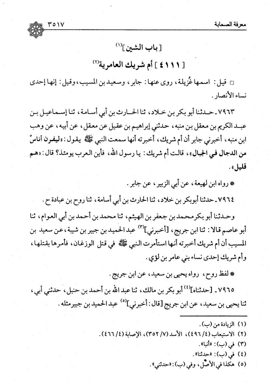 ٧٩٦٤ - حَدَّثَنَا أَبُو بَكْرِ بْنُ خَلَّادٍ، ثنا الْحَارِثُ بْنُ أَبِي أُسَامَةَ، ثنا رَوْحُ بْنُ عُبَادَةَ، ح، وَحَدَّثَنَا أَبُو بَكْرٍ مُحَمَّدُ بْنُ جَعْفَرِ بْنِ الْهَيْثَمِ، ثنا مُحَمَّدُ بْنُ أَحْمَدَ بْنِ أَبِي الْعَوَّامِ، ثنا أَبُو عَاصِمٍ، قَالَا: ثنا ابْنُ جُرَيْجٍ، أَخْبَرَنِي عَبْدُ الْحَمِيدِ بْنُ جُبَيْرِ بْنِ شَيْبَةَ، عَنْ سَعِيدِ بْنِ الْمُسَيِّبِ، أَنَّ أُمَّ شَرِيكٍ، أَخْبَرَتْهُ «أَنَّهَا، اسْتَأْمَرَتِ النَّبِيَّ صَلَّى اللَّهُ عَلَيْهِ وَسَلَّمَ فِي قَتْلِ الْوِزْغَانِ،» فَأَمَرَهَا بِقَتْلِهَا، " وَأُمُّ شَرِيكٍ إِحْدَى نِسَاءِ بَنِي عَامِرِ بْنِ لُؤَيٍّ لَفْظُ رَوْحٍ، رَوَاهُ يَحْيَى بْنُ سَعِيدٍ، عَنِ ابْنِ جُرَيْجٍ