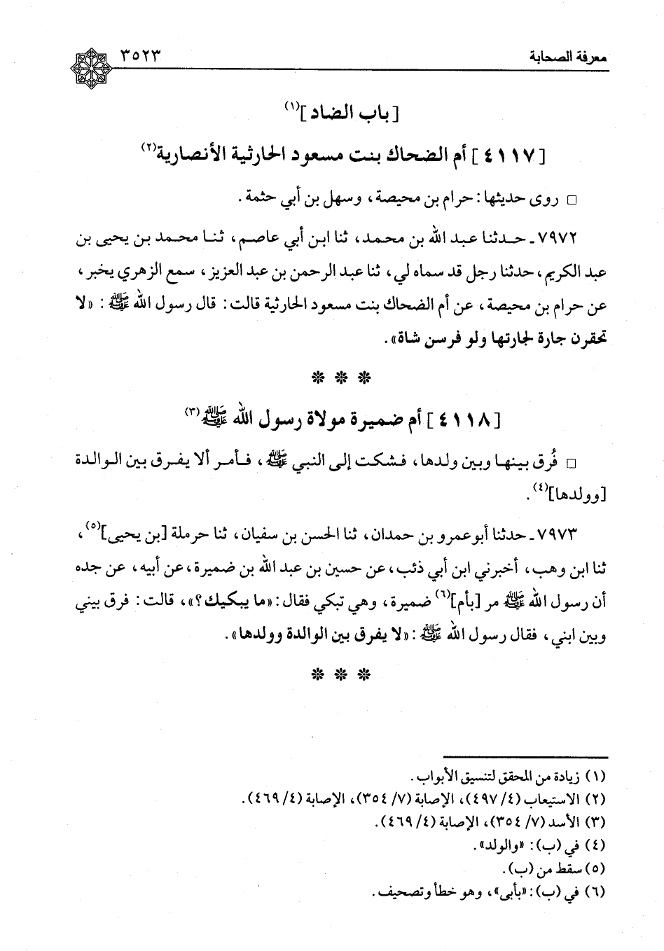أُمُّ الضَّحَّاكِ بِنْتُ مَسْعُودٍ الْحَارِثِيَّةُ الْأَنْصَارِيَّةُ رَوَى حَدِيثَهَا: حَرَامُ بْنُ مُحَيِّصَةَ، وَسَهْلُ بْنُ أَبِي حَثْمَةَ