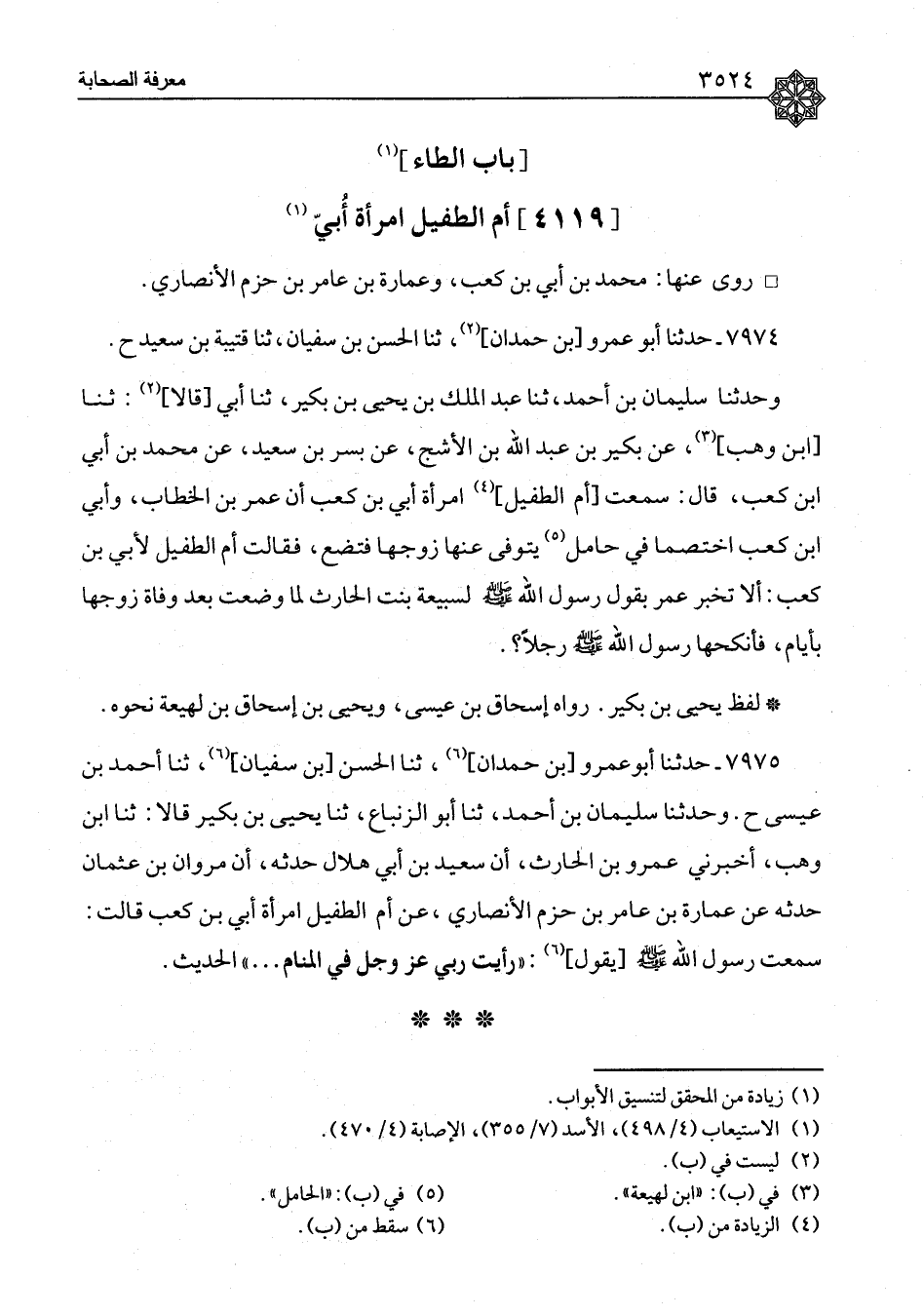 ٧٩٧٥ - حَدَّثَنَا أَبُو عَمْرِو بْنُ حَمْدَانَ، ثنا الْحَسَنُ بْنُ سُفْيَانَ، ثنا أَحْمَدُ بْنُ عِيسَى، ح، وَحَدَّثَنَا سُلَيْمَانُ بْنُ أَحْمَدَ، ثنا أَبُو الزِّنْبَاعِ، ثنا يَحْيَى بْنُ بُكَيْرٍ، قَالَا: ثنا ابْنُ وَهْبٍ، أَخْبَرَنِي عَمْرُو بْنُ الْحَارِثِ، أَنَّ سَعِيدَ بْنَ أَبِي هِلَالٍ، حَدَّثَهُ، أَنَّ مَرْوَانَ بْنَ عُثْمَانَ حَدَّثَهُ، عَنْ عُمَارَةَ بْنِ عَامِرِ بْنِ حَزْمٍ الْأَنْصَارِيِّ، عَنْ أُمِّ الطُّفَيْلِ، امْرَأَةِ أُبَيِّ بْنِ كَعْبٍ، قَالَتْ: سَمِعْتُ رَسُولَ اللهِ صَلَّى اللَّهُ عَلَيْهِ وَسَلَّمَ يَقُولُ: «رَأَيْتُ رَبِّيَ عَزَّ وَجَلَّ فِي الْمَنَامِ. .» الْحَدِيثُ