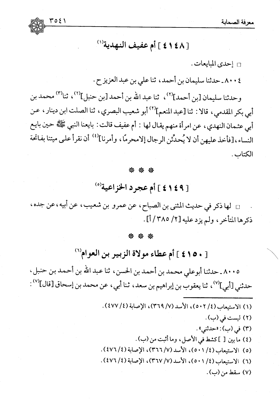 ٨٠٠٤ - حَدَّثَنَا سُلَيْمَانُ بْنُ أَحْمَدَ، ثنا عَلِيُّ بْنُ عَبْدِ الْعَزِيزِ، ح، وَحَدَّثَنَا سُلَيْمَانُ بْنُ أَحْمَدَ، ثنا عَبْدُ اللهِ بْنُ أَحْمَدَ بْنِ حَنْبَلٍ، ثنا مُحَمَّدُ بْنُ أَبِي بَكْرٍ الْمُقَدَّمِيُّ، قَالَا: ثنا عَبْدُ الْمُنْعِمِ أَبُو شُعَيْبٍ الْبَصْرِيُّ، ثنا الصَّلْتُ بْنُ دِينَارٍ، عَنْ أَبِي عُثْمَانَ النَّهْدِيِّ، عَنِ امْرَأَةٍ مِنْهُمْ يُقَالُ لَهَا: أُمُّ عَفِيفٍ، قَالَتْ: «بَايَعَنَا النَّبِيُّ صَلَّى اللَّهُ عَلَيْهِ وَسَلَّمَ حِينَ بَايَعَ النِّسَاءَ، فَأَخَذَ عَلَيْهِنَّ أَنْ لَا يُحَدِّثْنَ الرِّجَالَ إِلَّا مَحْرَمًا، وَأُمِرْنَا أَنْ نَقْرَأَ عَلَى مَيِّتِنَا بِفَاتِحَةِ الْكِتَابِ»