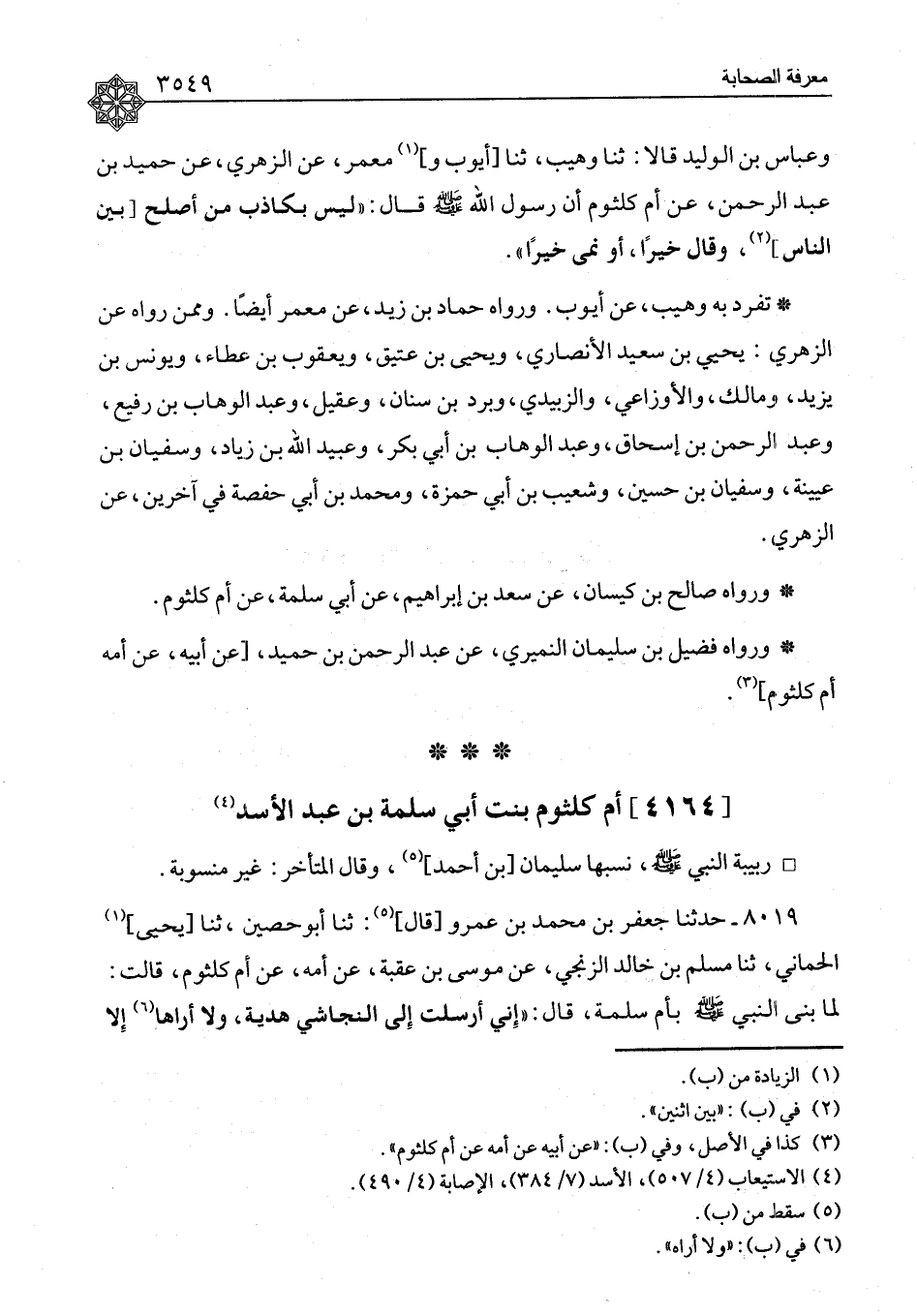أُمُّ كُلْثُومٍ بِنْتُ أَبِي سَلَمَةَ بْنِ عَبْدِ الْأَسَدِ رَبِيبَةُ النَّبِيِّ صَلَّى اللَّهُ عَلَيْهِ وَسَلَّمَ، نَسَبَهَا سُلَيْمَانُ بْنُ أَحْمَدَ، وَقَالَ الْمُتَأَخِّرُ: غَيْرُ مَنْسُوبَةٍ