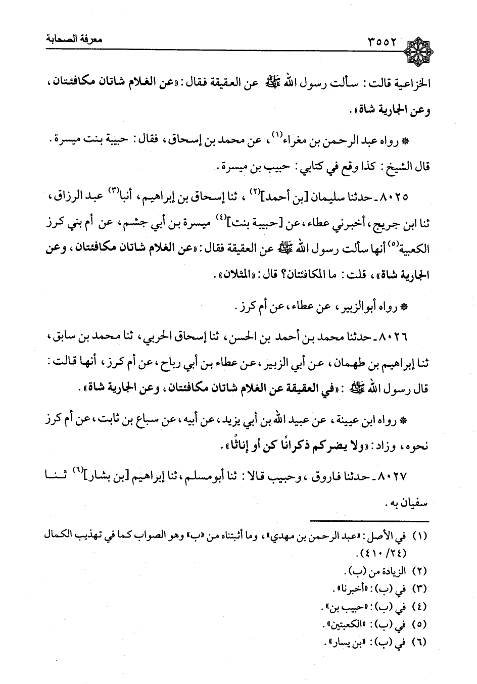 ٨٠٢٥ - حَدَّثَنَا سُلَيْمَانُ بْنُ أَحْمَدَ، ثنا إِسْحَاقُ بْنُ إِبْرَاهِيمَ، أَنْبَأَ عَبْدُ الرَّزَّاقِ، ثنا ابْنُ جُرَيْجٍ، أَخْبَرَنِي عَطَاءٌ، عَنْ حَبِيبَةَ بِنْتِ مَيْسَرَةَ بْنِ أَبِي خُثَيْمٍ، عَنْ أُمِّ بَنِي كُرْزٍ الْكَعْبِيَّةِ، أَنَّهَا سَأَلَتْ رَسُولَ اللهِ صَلَّى اللَّهُ عَلَيْهِ وَسَلَّمَ عَنِ الْعَقِيقَةِ، فَقَالَ: «عَنِ الْغُلَامِ شَاتَانِ مُكَافِئَتَانِ، وَعَنِ الْجَارِيَةِ شَاةٌ» قُلْتُ: مَا الْمُكَافِئَتَانِ؟ قَالَ: «الْمِثْلَانِ» رَوَاهُ أَبُو الزُّبَيْرِ، عَنْ عَطَاءٍ، عَنْ أُمِّ كُرْزٍ