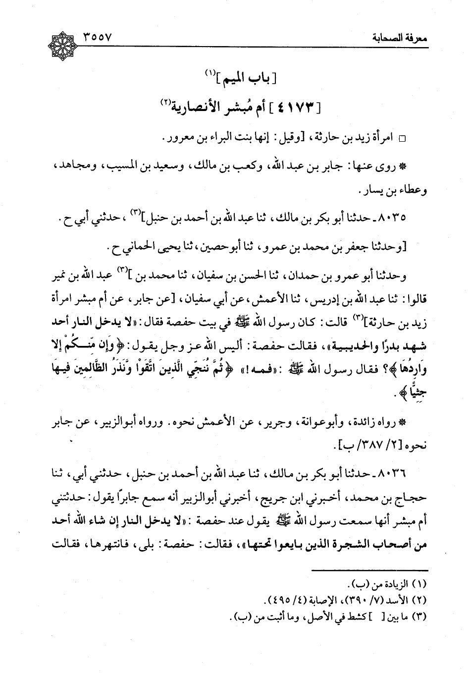 ٨٠٣٥ - حَدَّثَنَا أَبُو بَكْرِ بْنُ مَالِكٍ، ثنا عَبْدُ اللهِ بْنُ أَحْمَدَ بْنِ حَنْبَلٍ، حَدَّثَنِي أَبِي، ح وَحَدَّثَنَا جَعْفَرُ بْنُ مُحَمَّدِ بْنِ عَمْرٍو، ثنا أَبُو حَصِينٍ، ثنا يَحْيَى الْحِمَّانِيُّ، ح، وَحَدَّثَنَا أَبُو عَمْرِو بْنُ حَمْدَانَ، ثنا الْحَسَنُ بْنُ سُفْيَانَ، ثنا مُحَمَّدُ بْنُ عَبْدِ اللهِ بْنِ نُمَيْرٍ، قَالُوا: ثنا عَبْدُ اللهِ بْنُ إِدْرِيسَ، ثنا الْأَعْمَشُ، عَنْ أَبِي سُفْيَانَ، عَنْ جَابِرٍ، عَنْ أُمِّ مُبَشِّرٍ، امْرَأَةِ زَيْدِ بْنِ حَارِثَةَ، قَالَتْ: كَانَ رَسُولُ اللهِ صَلَّى اللَّهُ عَلَيْهِ وَسَلَّمَ فِي بَيْتِ حَفْصَةَ، فَقَالَ: «لَا يَدْخُلُ النَّارَ أَحَدٌ شَهِدَ بَدْرًا وَالْحُدَيْبِيَةَ» فَقَالَتْ حَفْصَةُ: أَلَيْسَ اللهُ عَزَّ وَجَلَّ يَقُولُ: {وَإِنْ مِنْكُمْ إِلَّا وَارِدُهَا} [مريم: ٧١] ؟ فَقَالَ رَسُولُ اللهِ صَلَّى اللَّهُ عَلَيْهِ وَسَلَّمَ: «فَمَهْ» {ثُمَّ نُنَجِّي الَّذِينَ اتَّقَوْا وَنَذَرُ الظَّالِمِينَ فِيهَا جِثِيًّا} [مريم: ٧٢] " رَوَاهُ زَائِدَةُ، وَأَبُو عَوَانَةَ، وَجَرِيرٌ، عَنِ الْأَعْمَشِ، نَحْوَهُ وَرَوَاهُ أَبُو الْزُّبَيْرِ، عَنْ جَابِرٍ نَحْوَهُ