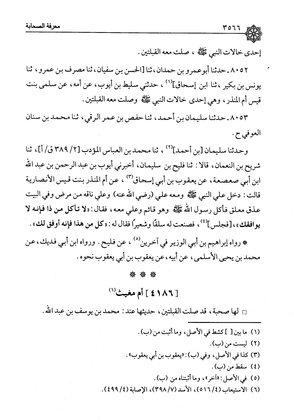 ٨٠٥٢ - حَدَّثَنَا أَبُو عَمْرِو بْنُ حَمْدَانَ، ثنا الْحَسَنُ بْنُ سُفْيَانَ، ثنا مُصَرِّفُ بْنُ عَمْرٍو، ثنا يُونُسُ بْنُ بُكَيْرٍ، ثنا ابْنُ إِسْحَاقَ، حَدَّثَنِي سَلِيطُ بْنُ أَيُّوبَ، عَنْ أُمِّهِ، عَنْ سَلْمَى بِنْتِ قَيْسٍ أُمِّ الْمُنْذِرِ، «وَهِيَ إِحْدَى خَالَاتِ النَّبِيِّ صَلَّى اللَّهُ عَلَيْهِ وَسَلَّمَ، وَصَلَّتْ مَعَهُ الْقِبْلَتَيْنِ»
