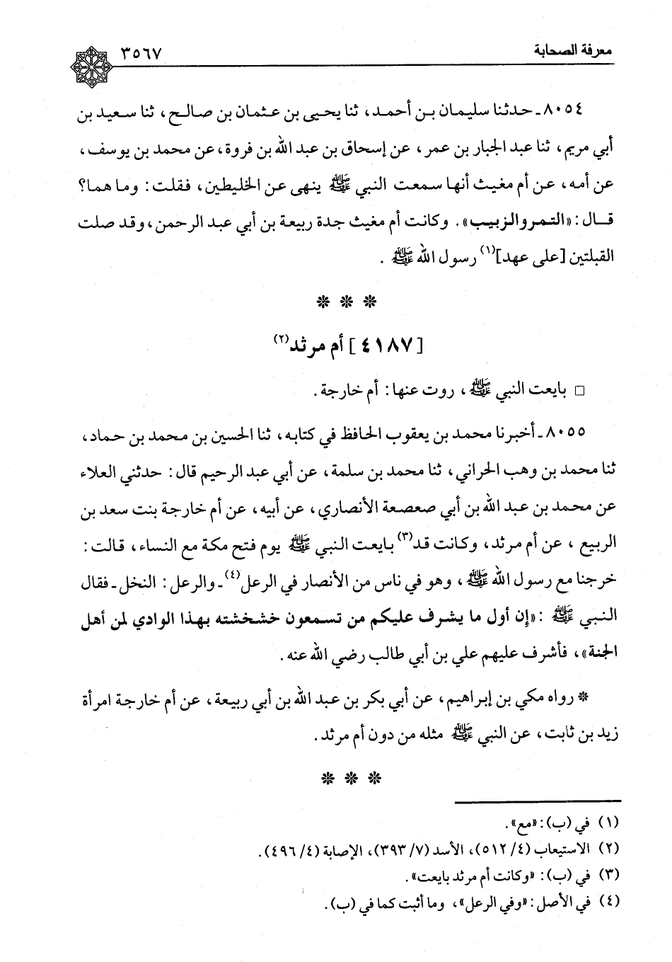 أُمُّ مَرْثَدٍ بَايَعَتِ النَّبِيَّ صَلَّى اللَّهُ عَلَيْهِ وَسَلَّمَ، رَوَتْ عَنْهَا: أُمُّ خَارِجَةَ