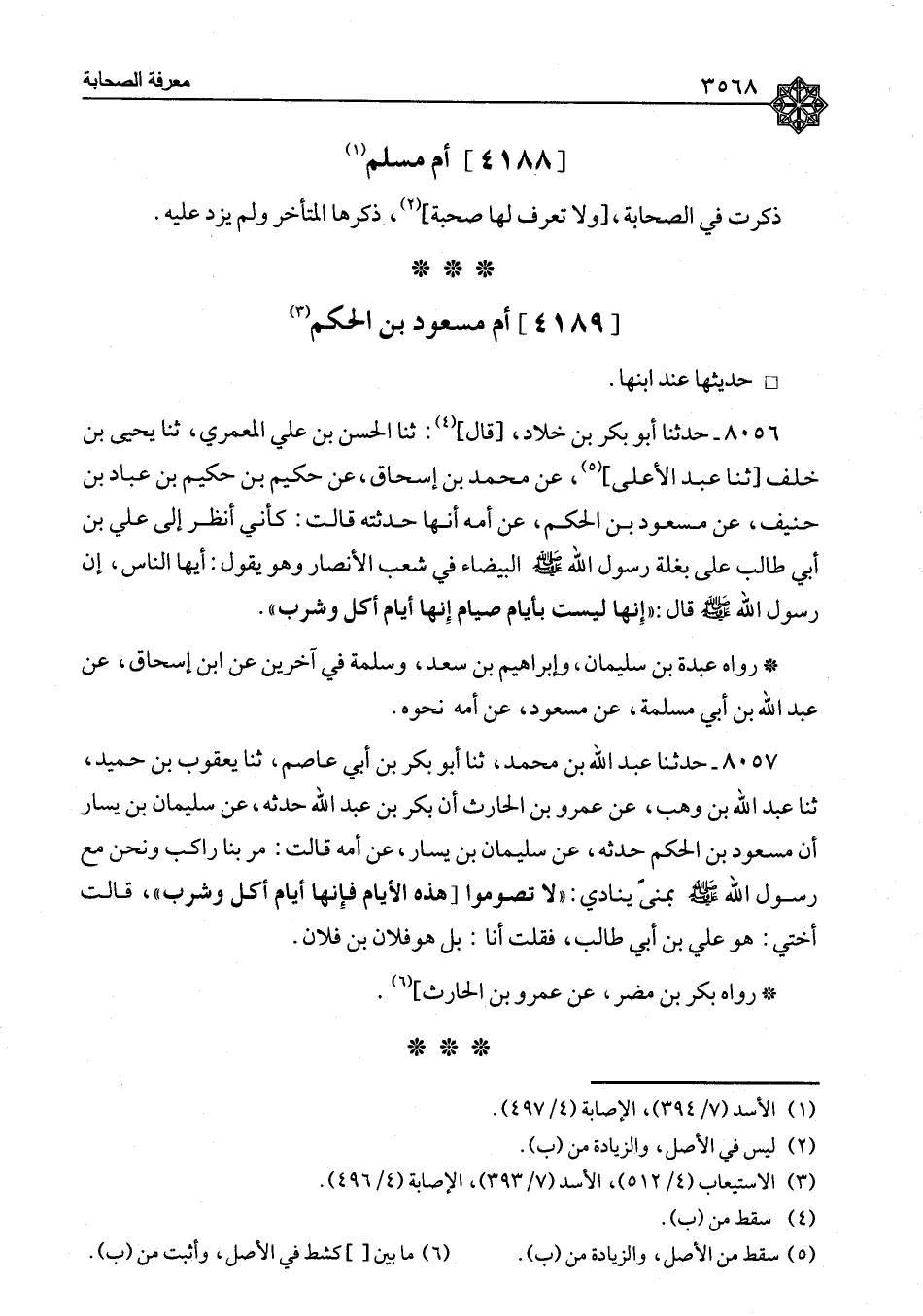 ٨٠٥٧ - حَدَّثَنَا عَبْدُ اللهِ بْنُ مُحَمَّدٍ، ثنا أَبُو بَكْرِ بْنُ أَبِي عَاصِمٍ، ثنا يَعْقُوبُ بْنُ حُمَيْدٍ، ثنا عَبْدُ اللهِ بْنُ وَهْبٍ، عَنْ عَمْرِو بْنِ الْحَارِثِ، أَنَّ بَكْرَ بْنَ عَبْدِ اللهِ حَدَّثَهُ، عَنْ سُلَيْمَانَ بْنِ يَسَارٍ، أَنَّ مَسْعُودَ بْنَ الْحَكَمِ حَدَّثَهُ، عَنْ سُلَيْمَانَ بْنِ يَسَارٍ، عَنْ أُمِّهِ، قَالَتْ: مَرَّ بِنَا رَاكِبٌ وَنَحْنُ مَعَ رَسُولِ اللهِ صَلَّى اللَّهُ عَلَيْهِ وَسَلَّمَ بِمِنًى يُنَادِي: «لَا تَصُومُوا هَذِهِ الْأَيَّامَ، فَإِنَّهَا أَيَّامُ أَكْلٍ وَشُرْبٍ» قَالَتْ أُخْتِي: هُوَ عَلِيُّ بْنُ أَبِي طَالِبٍ، فَقُلْتُ أَنَا: بَلْ هُوَ فُلَانُ بْنُ فُلَانٍ. رَوَاهُ بَكْرُ بْنُ مُضَرَ، عَنْ عَمْرِو بْنِ الْحَارِثِ