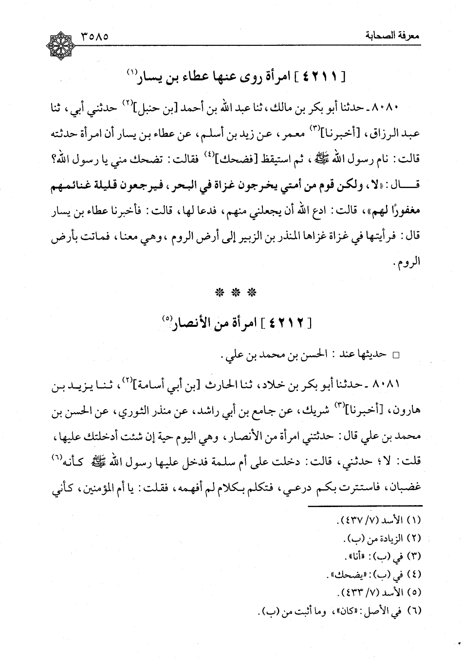 ٨٠٨٠ - حَدَّثَنَا أَبُو بَكْرِ بْنُ مَالِكٍ، ثنا عَبْدُ اللهِ بْنُ أَحْمَدَ بْنِ حَنْبَلٍ، حَدَّثَنِي أَبِي، ثنا عَبْدُ الرَّزَّاقِ، أَخْبَرَنَا مَعْمَرٌ، عَنْ زَيْدِ بْنِ أَسْلَمَ، عَنْ عَطَاءِ بْنِ يَسَارٍ، أَنَّ امْرَأَةً، حَدَّثَتْهُ قَالَتْ: نَامَ رَسُولُ اللهِ صَلَّى اللَّهُ عَلَيْهِ وَسَلَّمَ، ثُمَّ اسْتَيْقَظَ فَضَحِكَ، فَقَالَتْ: تَضْحَكُ مِنِّي يَا رَسُولَ اللهِ،؟ قَالَ: «لَا، وَلَكِنْ قَوْمٌ مِنْ أُمَّتِي يَخْرُجُونَ غُزَاةً فِي الْبَحْرِ، فَيَرْجِعُونَ قَلِيلَةً غَنَائِمُهُمْ مَغْفُورًا لَهُمْ» قَالَتِ: ادْعُ اللهَ أَنْ يَجْعَلَنِيَ مِنْهُمْ، فَدَعَا لَهَا.، قَالَتْ: فَأَخْبَرَنَا عَطَاءُ بْنُ يَسَارٍ، قَالَ: فَرَأَيْتُهَا فِي غَزَاةٍ غَزَاهَا الْمُنْذِرُ بْنُ الزُّبَيْرِ إِلَى أَرْضِ الرُّومِ، وَهِيَ مَعَنَا، فَمَاتَتْ بِأَرْضِ الرُّومِ