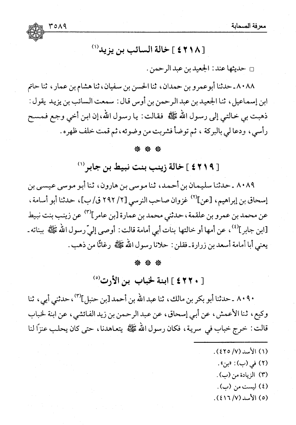 خَالَةُ السَّائِبِ بْنِ يَزِيدَ حَدِيثُهَا عِنْدَ: الْجُعَيْدِ بْنِ عَبْدِ الرَّحْمَنِ