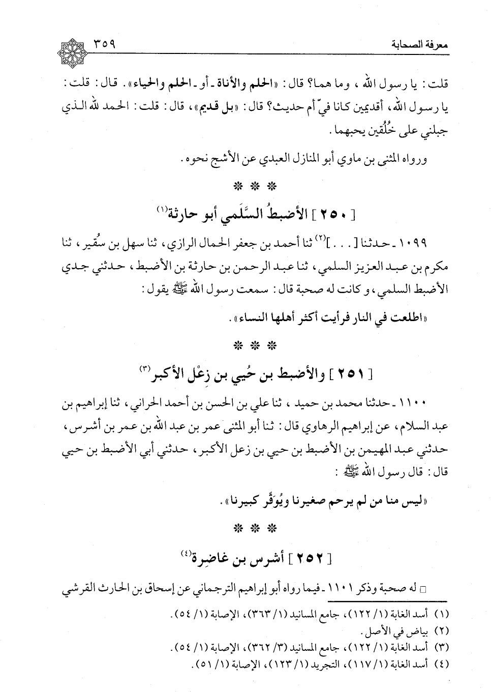 ١٠٩٩ - حَدَّثَنَا. . . . . ثنا أَحْمَدُ بْنُ جَعْفَرٍ الْحَمَّالُ الرَّازِيُّ، ثنا سَهْلُ بْنُ سُقَيْرٍ، ثنا مُكْرَمُ بْنُ عَبْدِ الْعَزِيزِ السُّلَمِيُّ، ثنا عَبْدُ الرَّحْمَنِ بْنُ حَارِثَةَ بْنِ الْأَضْبَطِ، حَدَّثَنِي جَدِّي الْأَضْبَطُ السَّلَمِيُّ، وَكَانَتْ لَهُ صُحْبَةٌ، قَالَ سَمِعْتُ رَسُولَ اللهِ صَلَّى اللَّهُ عَلَيْهِ وَسَلَّمَ يَقُولُ: «اطَّلَعْتُ فِي النَّارِ فَرَأَيْتُ أَكْثَرَ أَهْلِهَا النِّسَاءَ»