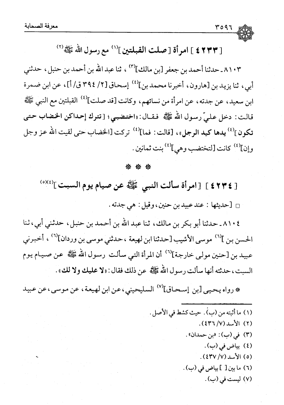 امْرَأَةٌ سَأَلَتِ النَّبِيَّ صَلَّى اللَّهُ عَلَيْهِ وَسَلَّمَ عَنْ صِيَامِ يَوْمِ السَّبْتِ حَدِيثُهَا: عِنْدَ عُبَيْدِ بْنِ حُنَيْنٍ، وَقِيلَ: هِيَ جَدَّتُهُ