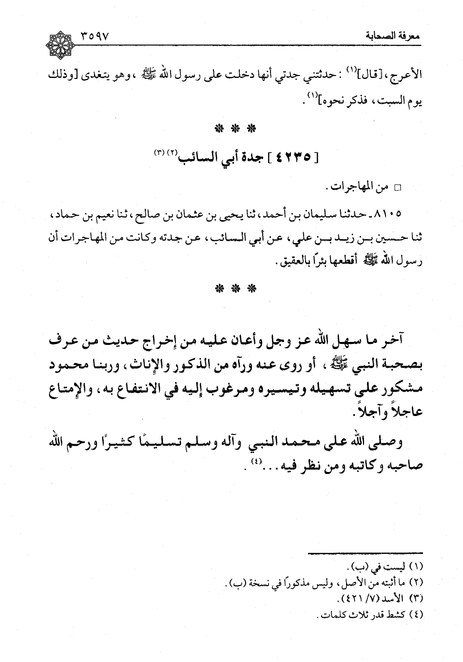 آخِرُ مَا سَهَّلَ اللهُ عَزَّ وَجَلَّ وَأَعَانَ عَلَيْهِ مِنْ إِخْرَاجِ حَدِيثِ مَنْ عُرِفَ بِصُحْبَةِ النَّبِيِّ صَلَّى اللَّهُ عَلَيْهِ وَسَلَّمَ، أَوْ رَوَى عَنْهُ وَرَآهُ مِنَ الذُّكُورِ وَالْإِنَاثِ، وَرَبُّنَا مَحْمُودٌ مَشْكُورٌ عَلَى تَسْهِيلِهِ وَتَيْسِيرِهِ وَمَرْغُوبٌ إِلَيْهِ فِي الِانْتِفَاعِ بِهِ، وَالْإِمْتَاعِ عَاجِلًا وَآجِلًا. وَصَلَّى الله عَلَى مُحَمَّدٍ النَّبِيِّ وَآلِهِ وَسَلَّمَ تَسْلِيمًا كَثِيرًا وَرَحِمَ اللهُ صَاحِبَهُ وَكَاتِبَهُ وَمَنْ نَظَرَ فِيهِ