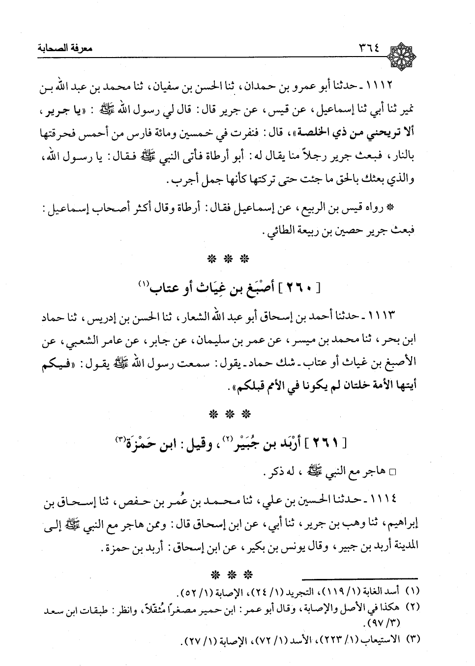 ١١١٢ - حَدَّثَنَا أَبُو عَمْرِو بْنُ حَمْدَانَ، ثنا الْحَسَنُ بْنُ سُفْيَانَ، ثنا مُحَمَّدُ بْنُ عَبْدِ اللهِ بْنِ نُمَيْرٍ، ثنا أَبِي، ثنا إِسْمَاعِيلُ، عَنْ قَيْسٍ، عَنْ جَرِيرٍ، قَالَ: قَالَ لِي رَسُولُ اللهِ صَلَّى اللَّهُ عَلَيْهِ وَسَلَّمَ: «يَا جَرِيرُ أَلَا تُرِيحُنِي مِنْ ذِي الْخَلَصَةِ» قَالَ: فَنَفَرْتُ فِي خَمْسِينَ وَمِائَةِ فَارِسٍ مِنْ أَحْمَسَ، فَحَرَّقْتُهَا بِالنَّارِ فَبَعَثَ جَرِيرٌ رَجُلًا مِنَّا يُقَالُ لَهُ أَبُو أَرْطَاةَ، فَأَتَى النَّبِيَّ صَلَّى اللَّهُ عَلَيْهِ وَسَلَّمَ فَقَالَ: يَا رَسُولَ اللهِ وَالَّذِي بَعَثَكَ بِالْحَقِّ مَا جِئْتُ حَتَّى تَرَكْتُهَا كَأَنَّهَا جَمَلٌ أَجْرَبُ " رَوَاهُ قَيْسُ بْنُ الرَّبِيعِ، عَنْ إِسْمَاعِيلَ، فَقَالَ أَرْطَاةُ وَقَالَ أَكْثَرُ أَصْحَابِ إِسْمَاعِيلَ: فَبَعَثَ جَرِيرٌ حُصَيْنَ بْنَ رَبِيعَةَ الطَّائِيَّ