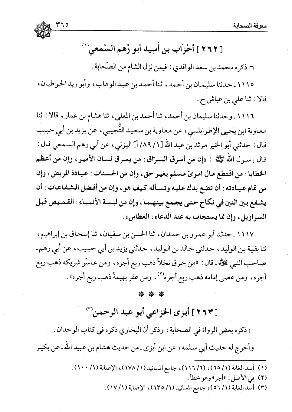 ١١١٧ - حَدَّثَنَا أَبُو عَمْرِو بْنُ حَمْدَانَ، ثنا الْحَسَنُ بْنُ سُفْيَانَ، ثنا إِسْحَاقُ بْنُ إِبْرَاهِيمَ، ثنا بَقِيَّةُ بْنُ الْوَلِيدِ، حَدَّثَنِي خَالِدُ بْنُ الْوَلِيدِ، حَدَّثَنِي يَزِيدُ بْنُ أَبِي حَبِيبٍ، عَنْ أَبِي رُهْمٍ، صَاحِبِ النَّبِيِّ صَلَّى اللَّهُ عَلَيْهِ وَسَلَّمَ قَالَ: «مَنْ حَرَّقَ نَخْلًا ذَهَبَ رُبْعُ أَجْرِهِ، وَمَنْ عَاسَرَ شَرِيكَهُ ذَهَبَ رُبْعُ أَجْرِهِ، وَمَنْ عَصَى إِمَامَهُ ذَهَبَ رُبْعُ أَجْرِهِ، وَمَنْ عَقَرَ بَهِيمَةً ذَهَبَ رُبْعُ أَجْرِهِ»