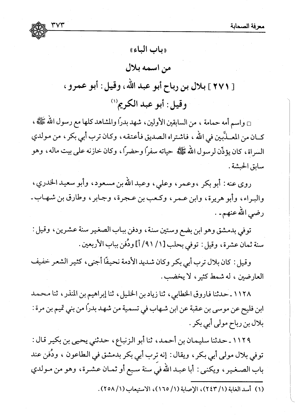 بِلَالُ بْنُ رَبَاحٍ أَبُو عَبْدِ اللهِ، وَقِيلَ: أَبُو عَمْرٍو، وَقِيلَ: أَبُو عَبْدِ الْكَرِيمِ وَاسْمُ أُمِّهِ حَمَامَةُ، مِنَ السَّابِقِينَ الْأَوَّلِينَ شَهِدَ بَدْرًا وَالْمَشَاهِدَ كُلَّهَا مَعَ رَسُولِ اللهِ صَلَّى اللَّهُ عَلَيْهِ وَسَلَّمَ، كَانَ مِنَ الْمُعَذَّبِينَ فِي اللهِ فَاشْتَرَاهُ الصِّدِّيقُ فَأَعْتَقَهُ، وَكَانَ تِرْبَ أَبِي بَكْرٍ مِنْ مَوْلِدِي السَّرَاةِ، كَانَ يُؤَذِّنُ لِرَسُولِ اللهِ صَلَّى اللَّهُ عَلَيْهِ وَسَلَّمَ حَيَاتَهُ سَفَرًا وَحَضَرًا، وَكَانَ خَازِنَهُ عَلَى بَيْتِ مَالِهِ، وَهُوَ سَابِقٌ الْحَبَشَةَ، رَوَى عَنْهُ أَبُو بَكْرٍ وَعُمَرُ وَعَلِيٌّ وَعَبْدُ اللهِ بْنُ مَسْعُودٍ وَأَبُو سَعِيدٍ الْخُدْرِيُّ، وَالْبَرَاءُ وَأَبُو هُرَيْرَةَ وَابْنُ عُمَرَ وَكَعْبُ بْنُ عُجْرَةَ وَجَابِرٌ وَطَارِقُ بْنُ شِهَابٍ رَضِيَ اللهُ عَنْهُمْ، تُوُفِّيَ بِدِمَشْقَ وَهُوَ ابْنُ بِضْعٍ وَسِتِّينَ سَنَةً وَدُفِنَ بِبَابِ الصَّغِيرِ سَنَةَ عِشْرِينَ، وَقِيلَ: سَنَةَ ثَمَانِ عَشْرَةَ، وَقِيلَ: تُوُفِّيَ بِحَلَبٍ وَدُفِنَ بِبَابِ الْأَرْبَعِينَ، وَقِيلَ: كَانَ بِلَالٌ تِرْبَ أَبِي بَكْرٍ، وَكَانَ شَدِيدَ الْأُدْمَةِ نَحِيفًا أَجْنَى كَثِيرَ الشَّعْرِ خَفِيفَ الْعَارِضَيْنِ لَهُ شَمَطٌ كَثِيرٌ لَا يَخْضِبُ