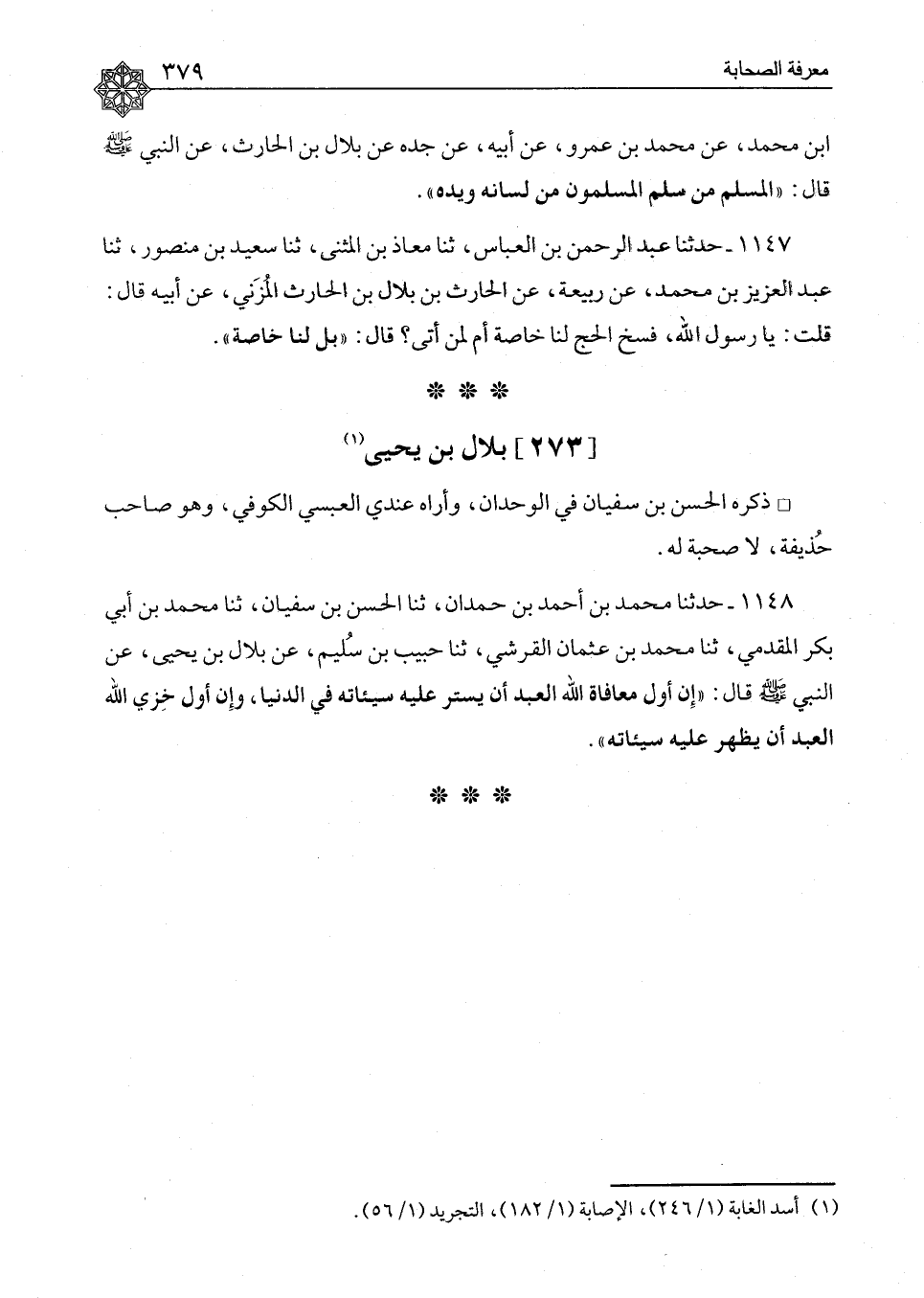 بِلَالُ بْنُ يَحْيَى ذَكَرَهُ الْحَسَنُ بْنُ سُفْيَانَ فِي الْوُحْدَانِ، وَأَرَاهُ عِنْدِي الْعَبْسِيَّ الْكُوفِيَّ، وَهُوَ صَاحِبُ حُذَيْفَةَ، لَا صُحْبَةَ لَهُ