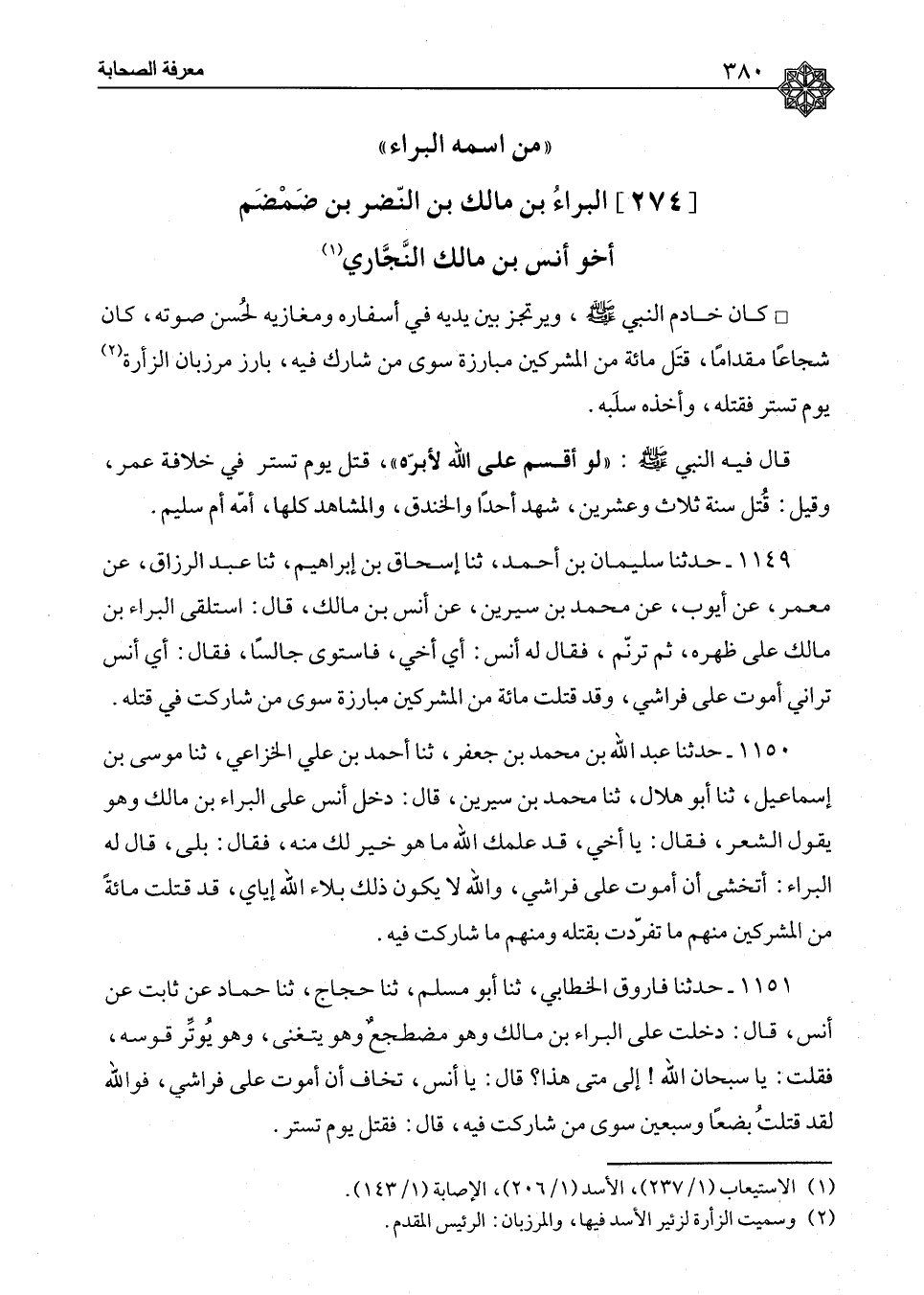 ١١٤٩ - حَدَّثَنَا سُلَيْمَانُ بْنُ أَحْمَدَ، ثنا إِسْحَاقُ بْنُ إِبْرَاهِيمَ، ثنا عَبْدُ الرَّزَّاقِ، عَنْ مَعْمَرٍ، عَنْ أَيُّوبَ، عَنْ مُحَمَّدِ بْنِ سِيرِينَ، عَنْ أَنَسِ بْنِ مَالِكٍ، قَالَ: " اسْتَلْقَى الْبَرَاءُ بْنُ مَالِكٍ عَلَى ظَهْرِهِ، ثُمَّ تَرَنَّمَ، فَقَالَ لَهُ أَنَسٌ: أَيْ أَخِي. فَاسْتَوَى جَالِسًا، فَقَالَ: أَيْ أَنَسُ، تَرَانِي أَمُوتُ عَلَى فِرَاشِي، وَقَدْ قَتَلْتُ مِائَةً مِنَ الْمُشْرِكِينَ مُبَارَزَةً، سِوَى مِنْ شَارَكْتُ فِي قَتْلِهِ؟ "