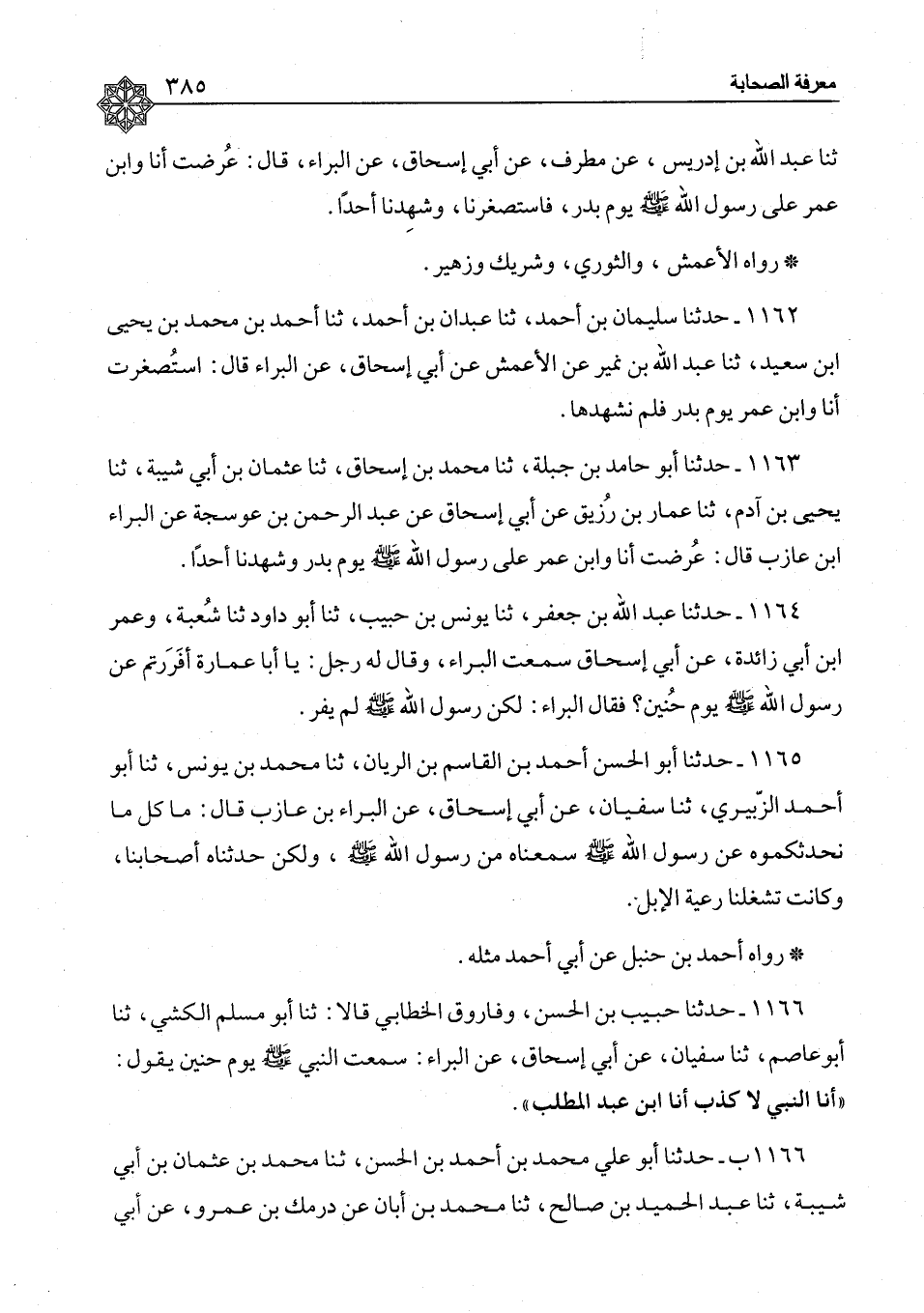 ١١٦٢ - حَدَّثَنَا سُلَيْمَانُ بْنُ أَحْمَدَ، ثنا عَبْدَانُ بْنُ أَحْمَدَ، ثنا أَحْمَدُ بْنُ مُحَمَّدِ بْنِ يَحْيَى بْنِ سَعِيدٍ، ثنا عَبْدُ اللهِ بْنُ نُمَيْرٍ، عَنِ الْأَعْمَشِ، عَنْ أَبِي إِسْحَاقَ، عَنِ الْبَرَاءِ، قَالَ: «اسْتُصْغِرْتُ أَنَا وَابْنُ عُمَرَ يَوْمَ بَدْرٍ، فَلَمْ نَشْهَدْهَا»