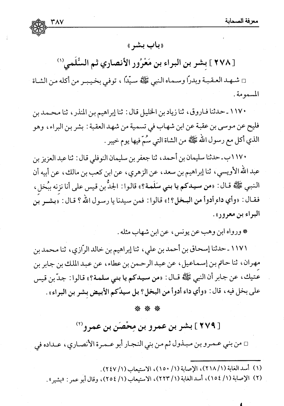 بِشْرُ بْنُ الْبَرَاءِ بْنِ مَعْرُورٍ الْأَنْصَارِيُّ ثُمَّ السُّلَمِيُّ شَهِدَ الْعَقَبَةَ وَبَدْرًا، وَسَمَّاهُ النَّبِيُّ صَلَّى اللَّهُ عَلَيْهِ وَسَلَّمَ سَيِّدًا، تُوُفِّيَ بِخَيْبَرَ مِنْ أَكْلِهِ مِنَ الشَّاةِ الْمَسْمُومَةِ