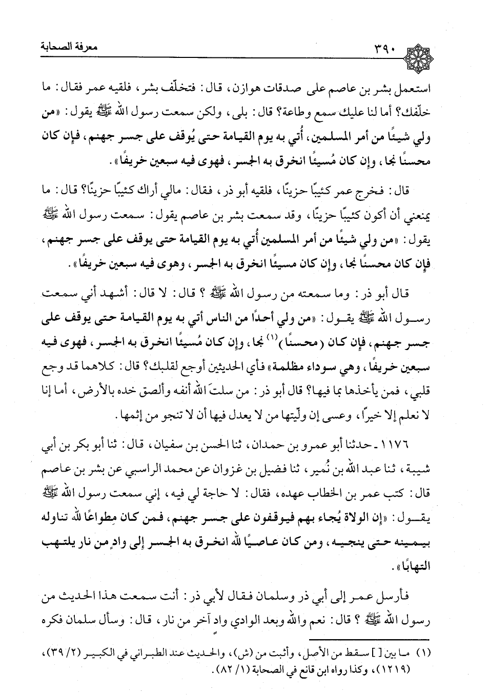 ١١٧٦ - حَدَّثَنَا أَبُو عَمْرِو بْنُ حَمْدَانَ، ثنا الْحَسَنُ بْنُ سُفْيَانَ، قَالَ: ثنا أَبُو بَكْرِ بْنُ أَبِي شَيْبَةَ، ثنا عَبْدُ اللهِ بْنُ نُمَيْرٍ، ثنا فُضَيْلُ بْنُ غَزْوَانَ، عَنْ مُحَمَّدٍ الرَّاسِبِيِّ، عَنْ بِشْرِ بْنِ عَاصِمٍ، قَالَ: كَتَبَ عُمَرُ بْنُ الْخَطَّابِ عَهْدَهُ، فَقَالَ: لَا حَاجَةَ لِي فِيهِ؛ إِنِّي سَمِعْتُ رَسُولَ اللهِ صَلَّى اللَّهُ عَلَيْهِ وَسَلَّمَ يَقُولُ: «إِنَّ الْوُلَاةَ يُجَاءُ بِهِمْ، فَيُوقَفُونَ عَلَى جِسْرِ جَهَنَّمَ، فَمَنْ كَانَ مِطْوَاعًا لِلَّهِ تَنَاوَلَهُ بِيَمِينِهِ حَتَّى يُنَجِّيَهُ، وَمَنْ كَانَ عَاصِيًا لِلَّهِ انْخَرَقَ بِهِ الْجِسْرُ إِلَى وَادٍ مِنْ نَارٍ يَلْتَهِبُ الْتِهَابًا» . فَأَرْسَلَ عُمَرُ إِلَى أَبِي ذَرٍّ وَسَلْمَانَ، فَقَالَ لِأَبِي ذَرٍّ: أَنْتَ سَمِعْتَ هَذَا الْحَدِيثَ مِنْ رَسُولِ اللهِ صَلَّى اللَّهُ عَلَيْهِ وَسَلَّمَ؟ قَالَ: نَعَمْ وَاللهِ، وَبَعْدَ الْوَادِي وَادٍ آخَرُ مِنْ نَارٍ قَالَ: وَسَأَلَ سَلْمَانَ، فَكَرِهَ ⦗٣٩١⦘ أَنْ يُخْبِرَهُ بِشَيْءٍ، فَقَالَ عُمَرُ: مَنْ يَأْخُذُهَا بِمَا فِيهَا؟ فَقَالَ أَبُو ذَرٍّ: مَنْ سَلَتَ اللهُ أَنْفَهُ وَعَيْنَيْهِ، وَأَضْرَعَ خَدَّهُ إِلَى الْأَرْضِ " وَرَوَاهُ يَحْيَى بْنُ حَمْزَةَ الدِّمَشْقِيُّ قَالَ: حَدَّثَنِي عَمَّارُ بْنُ أَبِي يَحْيَى، عَنْ سَلَمَةَ بْنِ تَمِيمٍ، عَنْ عَطَاءِ بْنِ أَبِي رَبَاحٍ، عَنْ عَبْدِ اللهِ بْنِ سُفْيَانَ، عَنْ بِشْرِ بْنِ عَاصِمٍ مِثْلَهُ بِطُولِهِ