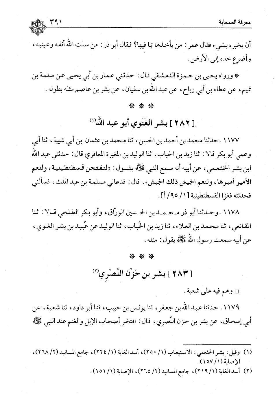 ١١٧٧ - حَدَّثَنَا مُحَمَّدُ بْنُ أَحْمَدَ بْنِ الْحَسَنِ، ثنا مُحَمَّدُ بْنُ عُثْمَانَ بْنِ أَبِي شَيْبَةَ، ثنا أَبِي وَعَمِّي أَبُو بَكْرٍ، قَالَا: ثنا زَيْدُ بْنُ الْحُبَابِ، ثنا الْوَلِيدُ بْنُ الْمُغِيرَةِ الْمَعَافِرِيُّ، قَالَ: حَدَّثَنِي عَبْدُ اللهِ بْنُ بِشْرٍ الْخَثْعَمِيُّ، عَنْ أَبِيهِ، أَنَّهُ سَمِعَ النَّبِيَّ صَلَّى اللَّهُ عَلَيْهِ وَسَلَّمَ يَقُولُ: «لَتُفْتَحَنَّ قُسْطَنْطِينِيَّةُ، وَلَنِعْمَ الْأَمِيرُ أَمِيرُهَا، وَلَنِعْمَ الْجَيْشُ ذَلِكَ الْجَيْشُ» . قَالَ: فَدَعَانِي مَسْلَمَةُ بْنُ عَبْدِ الْمَلِكِ، فَسَأَلَنِي، فَحَدَّثْتُهُ، فَغَزَا الْقُسْطَنْطِينِيَّةَ "