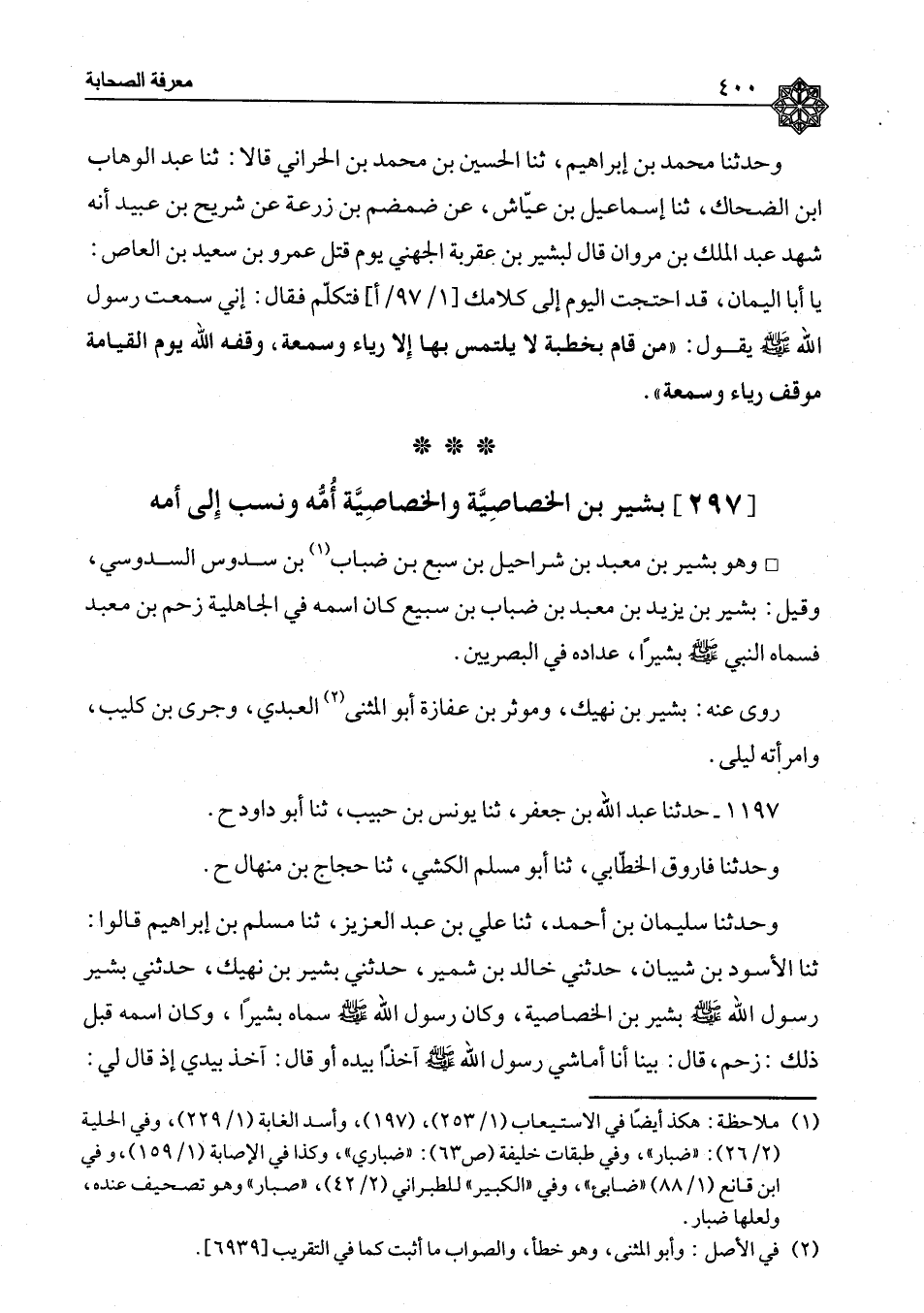 بَشِيرُ ابْنُ الْخَصَاصِيَةِ. وَالْخَصَاصِيَةُ أُمُّهُ، وَنُسِبَ إِلَى أُمِّهِ وَهُوَ بَشِيرُ بْنُ مَعْبَدِ بْنِ شَرَاحِيلَ بْنِ سَبْعِ بْنِ ضِبَابِ بْنِ سَدُوسٍ السَّدُوسِيُّ، وَقِيلَ: بَشِيرُ بْنُ يَزِيدَ بْنِ مَعْبَدِ بْنِ ضِبَابِ بْنِ سُبَيْعٍ، كَانَ اسْمُهُ فِي الْجَاهِلِيَّةِ زَحْمُ بْنُ مَعْبَدٍ، فَسَمَّاهُ النَّبِيُّ صَلَّى اللَّهُ عَلَيْهِ وَسَلَّمَ بَشِيرًا. عِدَادُهُ فِي الْبَصْرِيِّينَ، رَوَى عَنْهُ بَشِيرُ بْنُ نَهِيكٍ، وَمُوثِرُ بْنُ عَفَازَةَ أَبُو الْمُثَنَّى الْعَبْدِيُّ، وَجُرَيُّ بْنُ كُلَيْبٍ، وَامْرَأَتُهُ لَيْلَى