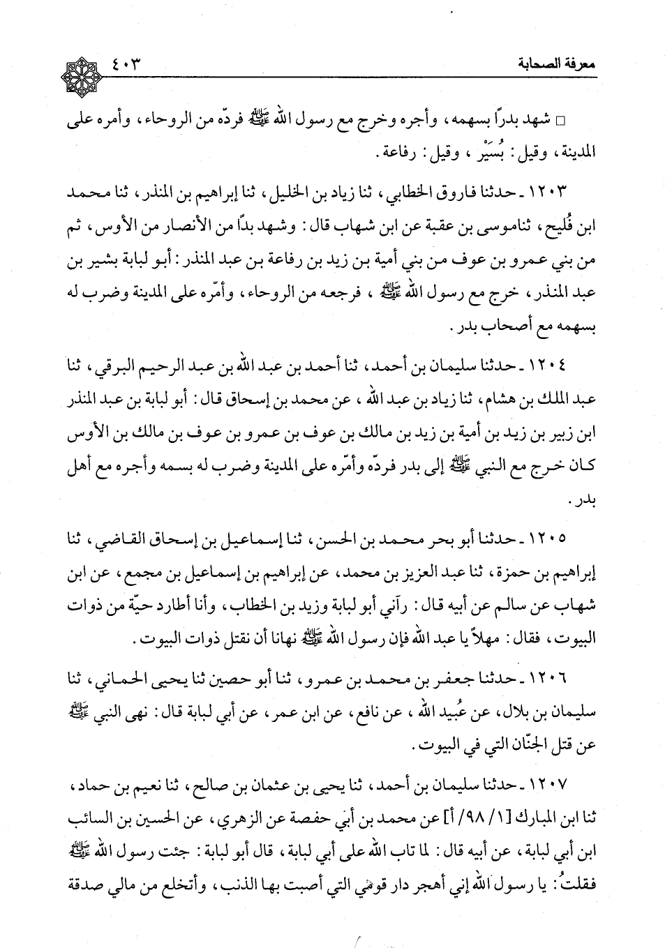 ١٢٠٣ - حَدَّثَنَا فَارَوقٌ الْخَطَّابِيُّ، ثنا زِيَادُ بْنُ الْخَلِيلِ، ثنا إِبْرَاهِيمُ بْنُ الْمُنْذِرِ، ثنا مُحَمَّدُ بْنُ فُلَيْحٍ، ثنا مُوسَى بْنُ عُقْبَةَ، عَنِ ابْنِ شِهَابٍ، قَالَ: «وَشَهِدَ بَدْرًا مِنَ الْأَنْصَارِ مِنَ الْأَوْسِ، ثُمَّ مِنْ بَنِي عَمْرِو بْنِ عَوْفٍ مِنْ بَنِي أُمَيَّةَ بْنِ زَيْدِ بْنِ رِفَاعَةَ بْنِ عَبْدِ الْمُنْذِرِ أَبُو لُبَابَةَ بَشِيرُ بْنُ عَبْدِ الْمُنْذِرِ، خَرَجَ مَعَ رَسُولِ اللهِ صَلَّى اللَّهُ عَلَيْهِ وَسَلَّمَ فَرَجَعَهُ مِنَ الرَّوْحَاءِ، وَأَمَّرَهُ عَلَى الْمَدِينَةِ، وَضَرَبَ لَهُ بِسَهْمِهِ مَعَ أَصْحَابِ بَدْرٍ»