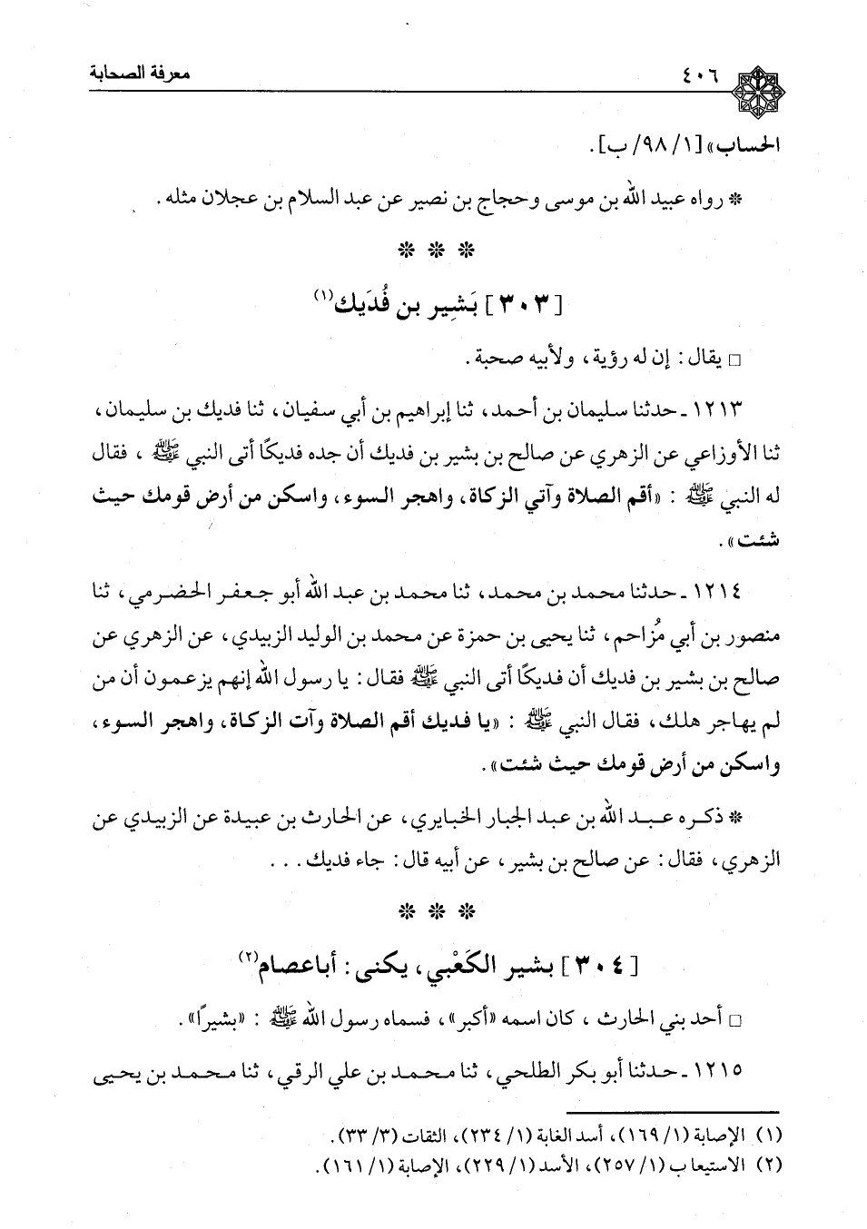 ١٢١٥ - حَدَّثَنَا أَبُو بَكْرٍ الطَّلْحِيُّ، ثنا مُحَمَّدُ بْنُ عَلِيٍّ الرَّقِّيُّ، ثنا مُحَمَّدُ بْنُ يَحْيَى ⦗٤٠٧⦘ الْكَلْبِيُّ، ثنا الْحَسَنُ بْنُ أَعْيَنَ، عَنْ عِصَامِ بْنِ بَشِيرٍ الْحَارِثِيِّ الْبَصْرِيِّ، عَنْ أَبِيهِ، قَالَ: وَفَدْتُ عَلَى رَسُولِ اللهِ صَلَّى اللَّهُ عَلَيْهِ وَسَلَّمَ، فَقَالَ لِي: «مَا اسْمُكَ» ؟ فَقُلْتُ: أَكْبَرُ. فَقَالَ: «أَنْتَ بَشِيرٌ» رَوَاهُ سَعِيدُ بْنُ مَرْوَانَ بْنِ سَعْدٍ، وَعُمَيْرَةُ بْنُ عَبْدِ الْمُؤْمِنِ بْنِ مُسْلِمٍ أَبُو سَمَاعَةَ الرَّهَاوِيَّانِ، عَنْ عِصَامٍ