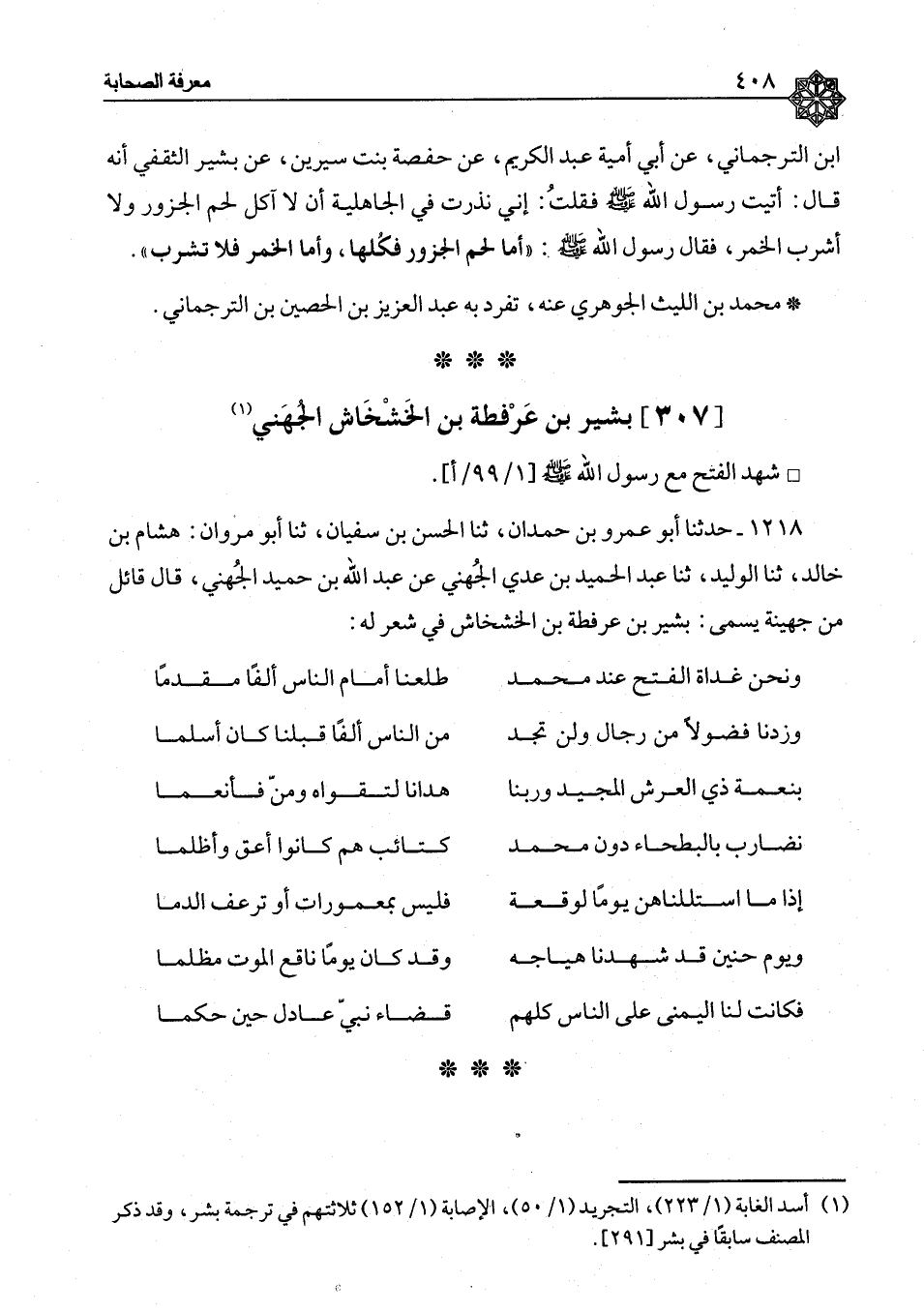 ١٢١٨ - حَدَّثَنَا أَبُو عَمْرِو بْنُ حَمْدَانَ، ثنا الْحَسَنُ بْنُ سُفْيَانَ، ثنا أَبُو مَرْوَانَ هِشَامُ بْنُ خَالِدٍ، ثنا الْوَلِيدُ، ثنا عَبْدُ الْحَمِيدِ بْنُ عَدِيٍّ الْجُهَنِيُّ، عَنْ عَبْدِ اللهِ بْنِ حُمَيْدٍ الْجُهَنِيِّ، قَالَ قَائِلٌ مِنْ جُهَيْنَةَ يُسَمَّى بَشِيرَ بْنَ عُرْفُطَةَ بْنِ الْخَشْخَاشِ فِي شِعْرٍ لَهُ: