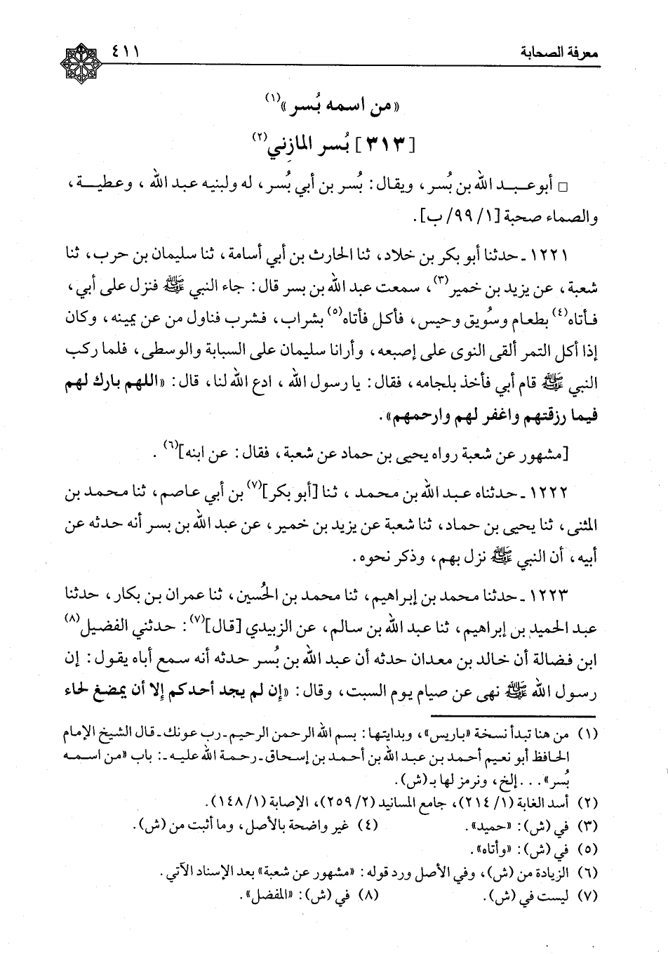 ١٢٢١ - حَدَّثَنَا أَبُو بَكْرِ بْنُ خَلَّادٍ، ثنا الْحَارِثُ بْنُ أَبِي أُسَامَةَ، ثنا سُلَيْمَانُ بْنُ حَرْبٍ، ثنا الْحَارِثُ بْنُ أَبِي أُسَامَةَ، ثنا سُلَيْمَانُ بْنُ حَرْبٍ، ثنا شُعْبَةُ، عَنْ يَزِيدَ بْنِ خُمَيْرٍ، سَمِعْتُ عَبْدَ اللهِ بْنَ بُسْرٍ، قَالَ: جَاءَ النَّبِيُّ صَلَّى اللَّهُ عَلَيْهِ وَسَلَّمَ، فَنَزَلَ عَلَى أَبِي، فَأَتَاهُ بِطَعَامٍ، وَسَوِيقٍ، وَحَيْسٍ، فَأَكَلَ، فَأَتَاهُ بِشَرَابٍ، فَشَرِبَ، فَنَاوَلَ مَنْ عَنْ يَمِينِهِ وَكَانَ إِذَا أَكَلَ التَّمْرَ أَلْقَى النَّوَى عَلَى إصْبُعِهِ - وَأَرَانَا سُلَيْمَانُ عَلَى السَّبَّابَةِ وَالْوُسْطَى - فَلَمَّا رَكِبَ النَّبِيُّ صَلَّى اللَّهُ عَلَيْهِ وَسَلَّمَ قَامَ أَبِي، فَأَخَذَ بِلِجَامِهِ، فَقَالَ: يَا رَسُولَ اللهِ، ادْعُ اللهَ لَنَا. قَالَ: " اللهُمَّ بَارِكْ لَهُمْ فِيمَا رَزَقْتَهُمْ، وَاغْفِرْ لَهُمْ وَارْحَمْهُمْ مَشْهُورٌ عَنْ شُعْبَةَ، رَوَاهُ يَحْيَى بْنُ حَمَّادٍ، عَنْ شُعْبَةَ فَقَالَ: عَنِ ابْنِهِ