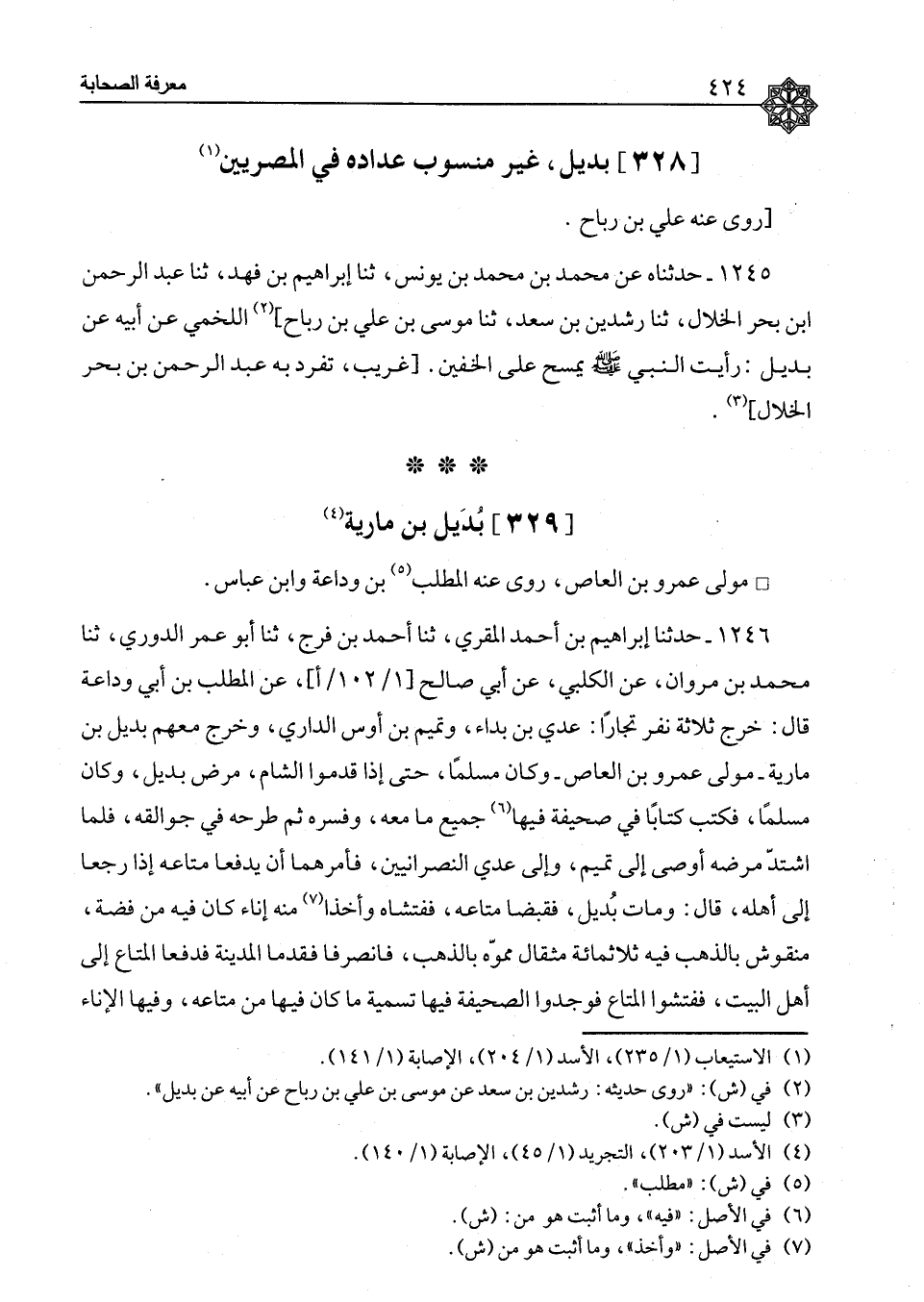 ١٢٤٥ - حُدِّثْنَاهُ عَنْ مُحَمَّدِ بْنِ مُحَمَّدِ بْنِ يُونُسَ، ثنا إِبْرَاهِيمُ بْنُ فَهْدٍ، ثنا عَبْدُ الرَّحْمَنِ بْنُ بَحْرٍ الْخَلَّالُ، ثنا رِشْدِينُ بْنُ سَعْدٍ، ثنا مُوسَى بْنُ عَلِيِّ بْنِ رَبَاحٍ اللَّخْمِيُّ، عَنْ أَبِيهِ، عَنْ بُدَيْلٍ: «رَأَيْتُ النَّبِيَّ صَلَّى اللَّهُ عَلَيْهِ وَسَلَّمَ يَمْسَحُ عَلَى الْخُفَّيْنِ» غَرِيبٌ، تَفَرَّدَ بِهِ عَبْدُ الرَّحْمَنِ بْنُ بَحْرٍ الْخَلَّالُ