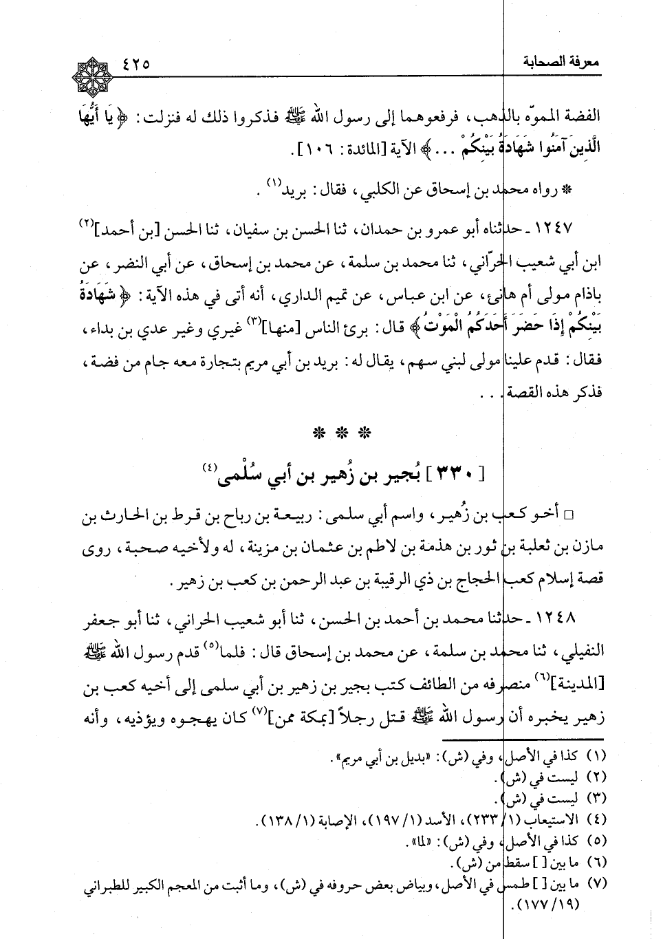 ١٢٤٧ - حَدَّثَنَاهُ أَبُو عَمْرِو بْنُ حَمْدَانَ، ثنا الْحَسَنُ بْنُ سُفْيَانَ، ثنا الْحَسَنُ بْنُ أَحْمَدَ بْنِ أَبِي شُعَيْبٍ الْحَرَّانِيُّ، ثنا مُحَمَّدُ بْنُ سَلَمَةَ، عَنْ مُحَمَّدِ بْنِ إِسْحَاقَ، عَنْ أَبِي النَّضْرِ، عَنْ بَاذَامَ، مَوْلَى أُمِّ هَانِئٍ، عَنِ ابْنِ عَبَّاسٍ، عَنْ تَمِيمٍ الدَّارِيِّ، أَنَّهُ أَتَى فِي هَذِهِ الْآيَةِ: {شَهَادَةُ بَيْنِكُمْ إِذَا حَضَرَ أَحَدَكُمُ الْمَوْتُ} [المائدة: ١٠٦] ، قَالَ: " بَرِئَ النَّاسُ مِنْهَا غَيْرِي، وَغَيْرُ عَدِيِّ بْنِ بَدَّاءٍ. فَقَالَ: قَدِمَ عَلَيْنَا مَوْلًى لِبَنِي سَهْمٍ، يُقَالُ لَهُ بُرَيْدُ بْنُ أَبِي مَرْيَمَ بِتِجَارَةٍ، مَعَهُ جَامٌ مِنْ فِضَّةٍ "، فَذَكَرَ هَذِهِ الْقِصَّةَ