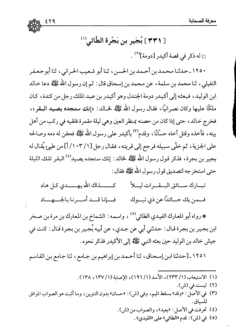 رَوَاهُ أَبُو الْمُعَارِكِ الْفَيْدِيُّ الطَّائِيُّ، وَاسْمُهُ الشَّمَّاخُ بْنُ الْمُعَارِكِ بْنِ مُرَّةَ بْنِ صَخْرِ بْنِ بُجَيْرِ بْنِ بَجَرَةَ قَالَ: حَدَّثَنِي أَبِي، عَنْ جَدِّي، عَنْ أَبِيهِ بُجَيْرِ بْنِ بَجَرَةَ قَالَ: كُنْتُ فِي جَيْشِ خَالِدِ بْنِ الْوَلِيدِ حِينَ بَعَثَهُ النَّبِيُّ صَلَّى اللَّهُ عَلَيْهِ وَسَلَّمَ إِلَى الْأُكَيْدِرِ". فَذَكَرَ نَحْوَهُ
