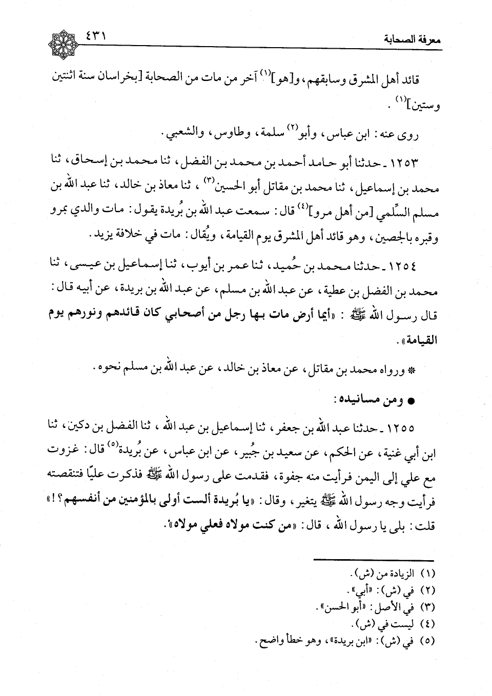 ١٢٥٤ - حَدَّثَنَا مُحَمَّدُ بْنُ حُمَيْدٍ، ثنا عُمَرُ بْنُ أَيُّوبَ، ثنا إِسْمَاعِيلُ بْنُ عِيسَى، ثنا مُحَمَّدُ بْنُ الْفَضْلِ بْنِ عَطِيَّةَ، عَنْ عَبْدِ اللهِ بْنِ مُسْلِمٍ، عَنْ عَبْدِ اللهِ بْنِ بُرَيْدَةَ، عَنْ أَبِيهِ، قَالَ: قَالَ رَسُولُ اللهِ صَلَّى اللَّهُ عَلَيْهِ وَسَلَّمَ: «أَيُّمَا أَرْضٍ مَاتَ بِهَا رَجُلٌ مِنْ أَصْحَابِي كَانَ قَائِدَهُمْ، وَنُورَهُمْ يَوْمَ الْقِيَامَةِ» وَرَوَاهُ مُحَمَّدُ بْنُ مُقَاتِلٍ، عَنْ مُعَاذِ بْنِ خَالِدٍ، عَنْ عَبْدِ اللهِ بْنِ مُسْلِمٍ نَحْوَهُ