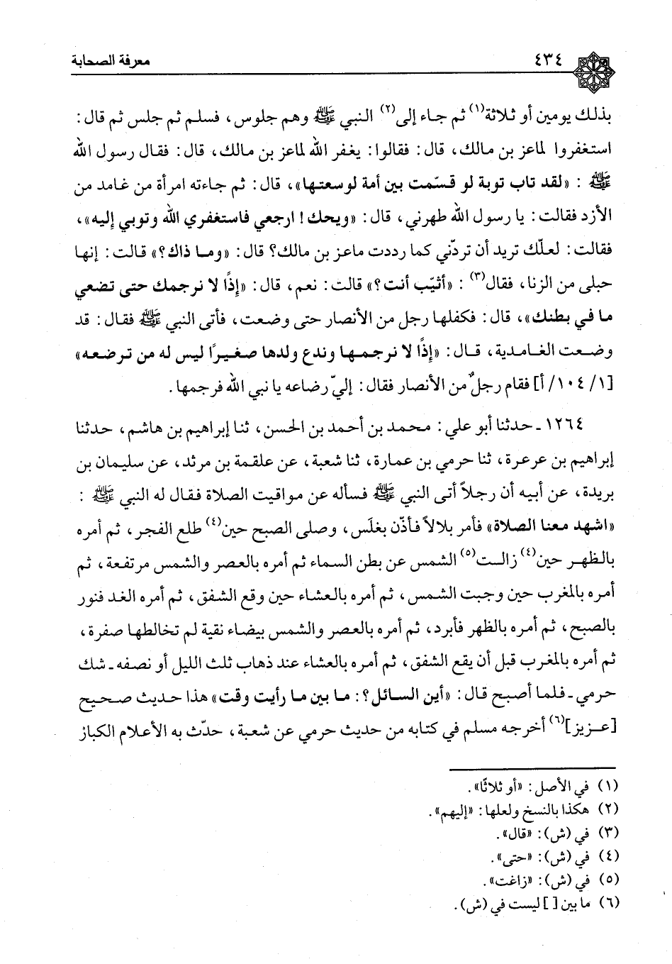 ١٢٦٤ - حَدَّثَنَا أَبُو عَلِيٍّ مُحَمَّدُ بْنُ أَحْمَدَ بْنِ الْحَسَنِ، ثنا إِبْرَاهِيمُ بْنُ هَاشِمٍ، حَدَّثَنَا إِبْرَاهِيمُ بْنُ عَرْعَرَةَ، ثنا حَرَمِيُّ بْنُ عُمَارَةَ، ثنا شُعْبَةُ، عَنْ عَلْقَمَةَ بْنِ مَرْثَدٍ، عَنْ سُلَيْمَانَ بْنِ بُرَيْدَةَ، عَنْ أَبِيهِ، أَنَّ رَجُلًا، أَتَى النَّبِيَّ صَلَّى اللَّهُ عَلَيْهِ وَسَلَّمَ، فَسَأَلَهُ عَنْ مَوَاقِيتِ الصَّلَاةِ، فَقَالَ لَهُ النَّبِيُّ صَلَّى اللَّهُ عَلَيْهِ وَسَلَّمَ: «اشْهَدْ مَعَنَا الصَّلَاةَ» . فَأَمَرَ بِلَالًا، فَأَذَّنَ بِغَلَسٍ، وَصَلَّى الصُّبْحَ حِينَ طَلَعَ الْفَجْرُ، ثُمَّ أَمَرَهُ بِالظُّهْرِ حِينَ زَالَتِ الشَّمْسُ عَنْ بَطْنِ السَّمَاءِ، ثُمَّ أَمَرَهُ بِالْعَصْرِ وَالشَّمْسُ مُرْتَفِعَةٌ، ثُمَّ أَمَرَهُ بِالْمَغْرِبِ حِينَ وَجَبَتِ الشَّمْسُ، ثُمَّ أَمَرَهُ بِالْعَشَاءِ حِينَ وَقَعَ الشَّفَقُ، ثُمَّ أَمَرَهُ الْغَدَ فَنَوَّرَ بِالصُّبْحِ، ثُمَّ أَمَرَهُ بِالظُّهْرِ، فَأَبْرَدَ، ثُمَّ أَمَرَهُ بِالْعَصْرِ وَالشَّمْسُ بَيْضَاءُ نَقِيَّةٌ، لَمْ تُخَالِطْهَا صُفْرَةٌ، ثُمَّ أَمَرَهُ بِالْمَغْرِبِ قَبْلَ أَنْ يَقَعَ الشَّفَقُ، ثُمَّ أَمَرَهُ بِالْعِشَاءِ عِنْدَ ذَهَابِ ثُلُثِ اللَّيْلِ أَوْ نِصْفِهِ - شَكَّ حَرَمِيٌّ - فَلَمَّا أَصْبَحَ قَالَ: «أَيْنَ السَّائِلُ؟ مَا بَيْنَ مَا رَأَيْتَ وَقْتٌ» هَذَا حَدِيثٌ صَحِيحٌ عَزِيزٌ، أَخْرَجَهُ مُسْلِمٌ فِي كِتَابِهِ مِنْ حَدِيثِ حَرَمِيٍّ، عَنْ شُعْبَةَ. حَدَّثَ بِهِ الْأَعْلَامُ الْكِبَارُ، ⦗٤٣٥⦘ عَنْ حَرَمِيٍّ. حَدَّثَ بِهِ أَبُو مَسْعُودٍ أَحْمَدُ بْنُ الْفُرَاتِ الرَّازِيُّ، عَنْ عَلِيِّ بْنِ الْمَدِينِيِّ، عَنْ حَرَمِيٍّ