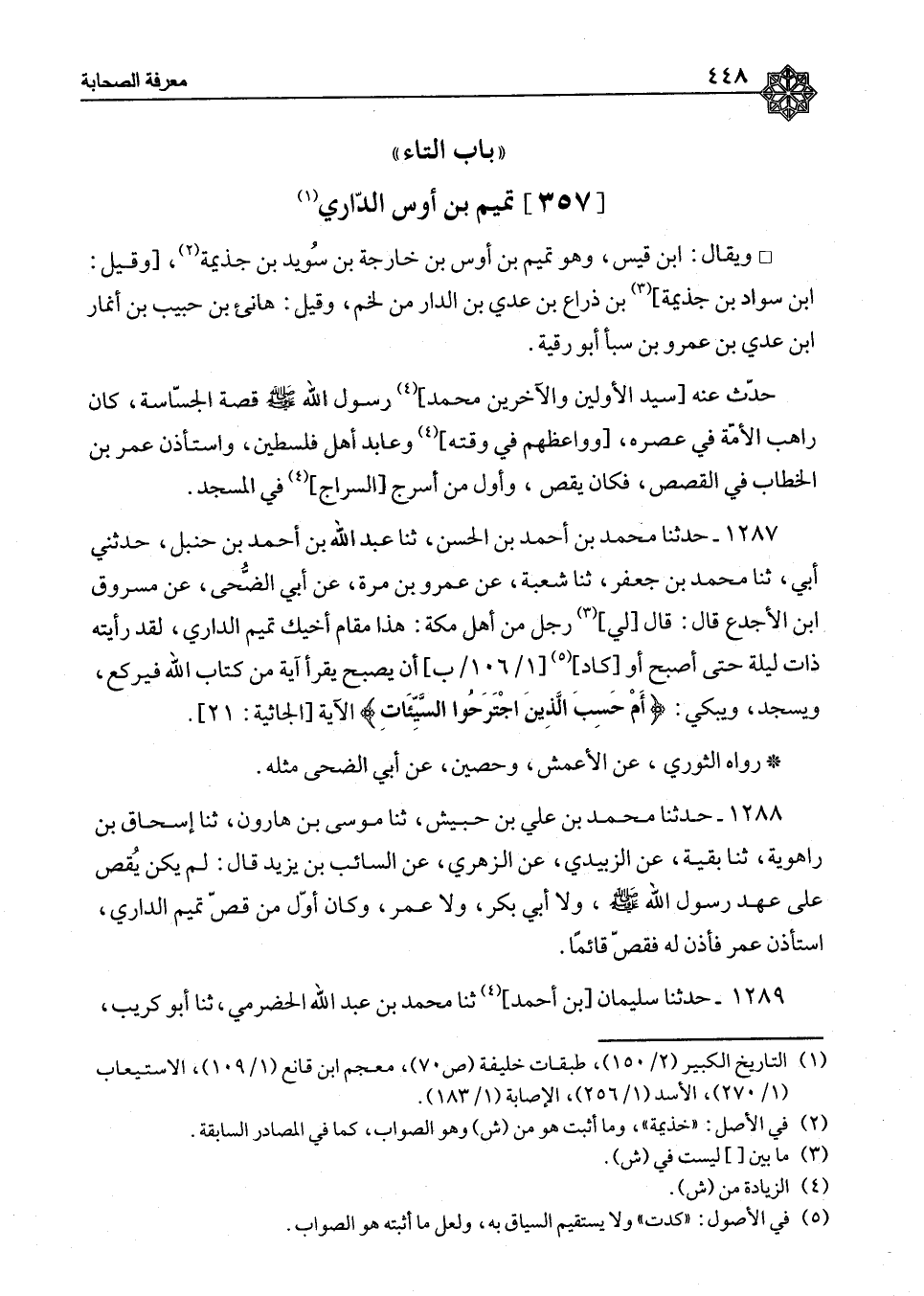 ١٢٨٧ - حَدَّثَنَا مُحَمَّدُ بْنُ أَحْمَدَ بْنِ الْحَسَنِ، ثنا عَبْدُ اللهِ بْنُ أَحْمَدَ بْنِ حَنْبَلٍ، حَدَّثَنِي أَبِي، ثنا مُحَمَّدُ بْنُ جَعْفَرٍ، ثنا شُعْبَةُ، عَنْ عَمْرِو بْنِ مُرَّةَ، عَنْ أَبِي الضُّحَى، عَنْ مَسْرُوقِ بْنِ الْأَجْدَعِ، قَالَ: قَالَ لِي رَجُلٌ مِنْ أَهْلِ مَكَّةَ: " هَذَا مَقَامُ أَخِيكَ تَمِيمٍ الدَّارِيِّ، لَقَدْ رَأَيْتُهُ ذَاتَ لَيْلَةٍ حَتَّى أَصْبَحَ، أَوْ كَادَ أَنْ يُصْبِحَ، يَقْرَأُ آيَةً مِنْ كِتَابِ اللهِ، فَيَرْكَعُ وَيَسْجُدُ وَيَبْكِي: {أَمْ حَسِبَ الَّذِينَ اجْتَرَحُوا السَّيِّئَاتِ} [الجاثية: ٢١] " الأيَةَ رَوَاهُ الثَّوْرِيُّ، عَنِ الْأَعْمَشِ وَحُصَيْنٍ، عَنْ أَبِي الضُّحَى مِثْلَهُ