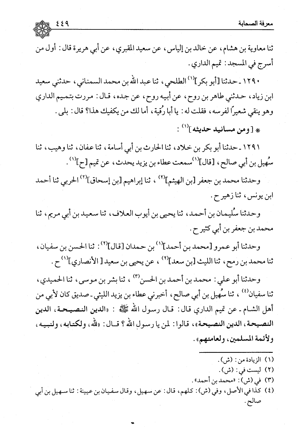 ١٢٩١ - حَدَّثَنَا أَبُو بَكْرِ بْنُ خَلَّادٍ، ثنا الْحَارِثُ بْنُ أَبِي أُسَامَةَ، ثنا عَفَّانُ، ثنا وُهَيْبٌ، ثنا سُهَيْلُ بْنُ أَبِي صَالِحٍ، قَالَ سَمِعْتُ عَطَاءَ بْنَ يَزِيدَ، يُحَدِّثُ عَنْ تَمِيمٍ ح وَحَدَّثَنَا مُحَمَّدُ بْنُ جَعْفَرِ بْنِ الْهَيْثَمِ، ثنا إِبْرَاهِيمُ بْنُ إِسْحَاقَ الْحَرْبِيُّ، ثنا أَحْمَدُ بْنُ يُونُسَ، ثنا زُهَيْرٌ ح وَحَدَّثَنَا سُلَيْمَانُ بْنُ أَحْمَدَ، ثنا يَحْيَى بْنُ أَيُّوبَ الْعَلَّافُ، ثنا سَعِيدُ بْنُ أَبِي مَرْيَمَ، ثنا مُحَمَّدُ بْنُ جَعْفَرِ بْنِ أَبِي كَثِيرٍ , ح وَحَدَّثَنَا أَبُو عَمْرٍو مُحَمَّدُ بْنُ أَحْمَدَ بْنِ حَمْدَانَ، قَالَ: ثنا الْحَسَنُ بْنُ سُفْيَانَ، ثنا مُحَمَّدُ بْنُ رُمْحٍ، ثنا اللَّيْثُ بْنُ سَعْدٍ، عَنْ يَحْيَى بْنِ سَعِيدٍ الْأَنْصَارِيِّ ح وَحَدَّثَنَا أَبُو عَلِيٍّ مُحَمَّدُ بْنُ أَحْمَدَ بْنِ الْحَسَنِ، ثنا بِشْرُ بْنُ مُوسَى، ثنا الْحُمَيْدِيُّ، ثنا سُفْيَانُ، ثنا سُهَيْلُ بْنُ أَبِي صَالِحٍ، أَخْبَرَنِي عَطَاءُ بْنُ يَزِيدَ اللَّيْثِيُّ، - صَدِيقٌ كَانَ لِأَبِي مِنْ أَهْلِ الشَّامِ - عَنْ تَمِيمٍ الدَّارِيِّ قَالَ: قَالَ رَسُولُ اللهِ صَلَّى اللَّهُ عَلَيْهِ وَسَلَّمَ: «الدِّينُ النَّصِيحَةُ، الدِّينُ النَّصِيحَةُ، الدِّينُ النَّصِيحَةُ» . قَالُوا: لِمَنْ يَا رَسُولَ اللهِ؟ قَالَ: «لِلَّهِ، وَلِكِتَابِهِ، وَلِنَبِيِّهِ، ⦗٤٥٠⦘ وَلِأَئِمَّةِ الْمُسْلِمِينَ، وَلِعَامَّتِهِمْ» لَفْظُ ابْنِ عُيَيْنَةَ، وَلَفْظُ مُحَمَّدٍ، وَيَحْيَى، وَوُهَيْبٍ مِثْلُهُ وَنَحْوُهُ. وَرَوَاهُ عَنْ سُهَيْلٍ: الثَّوْرِيُّ، وَزُهَيْرٌ، وَجَرِيرٌ، وَحَمَّادُ بْنُ سَلَمَةَ، وَالضَّحَّاكُ بْنُ عُثْمَانَ، وَابْنُ أَبِي حَازِمٍ، وَسُلَيْمَانُ التَّيْمِيُّ، وَخَالِدٌ الْوَاسِطِيُّ، وَإِسْمَاعِيلُ بْنُ عَيَّاشٍ، وَإِبْرَاهِيمُ بْنُ طَهْمَانَ، وَعُبَيْدُ اللهِ الْوَازِعُ، وَرَوْحُ بْنُ الْقَاسِمِ، كُلُّهُمْ عَنْ سُهَيْلٍ، عَنْ عَطَاءٍ مِثْلَهُ. وَرَوَاهُ مَالِكٌ، وَالثَّوْرِيُّ، وَعَبْدُ اللهِ بْنُ جَعْفَرٍ، عَنْ سُهَيْلٍ، عَنْ أَبِيهِ، عَنْ أَبِي هُرَيْرَةَ. وَرَوَاهُ الْقَعْقَاعُ بْنُ حَكِيمٍ، وَزَيْدُ بْنُ أَسْلَمَ، وَعُبَيْدُ اللهِ بْنُ مِقْسَمٍ، عَنْ أَبِي صَالِحٍ، عَنْ أَبِي هُرَيْرَةَ