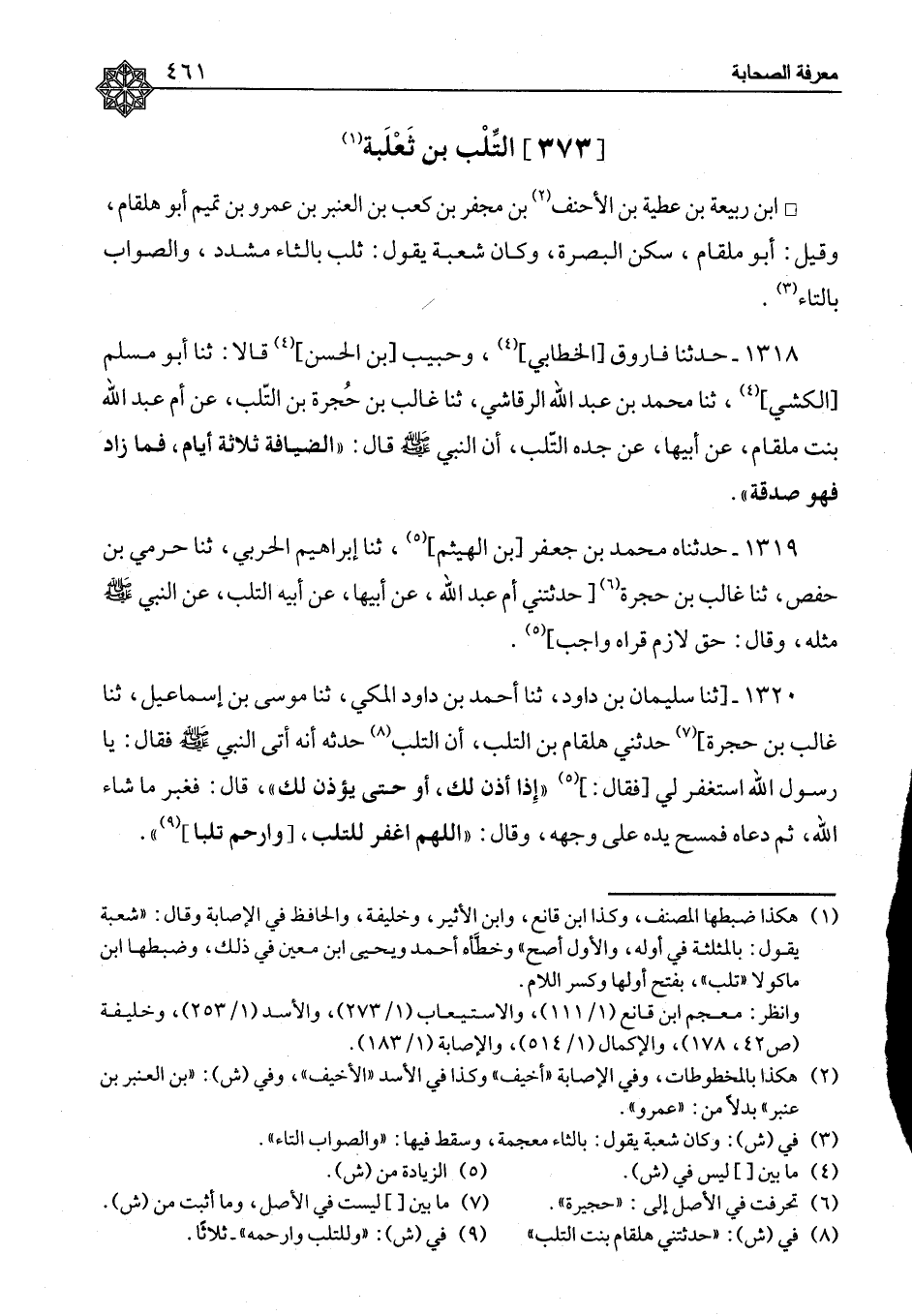 ١٣١٨ - حَدَّثَنَا فَارُوقٌ الْخَطَّابِيُّ، وَحَبِيبُ بْنُ الْحَسَنِ، قَالَا: ثنا أَبُو مُسْلِمٍ الْكَشِّيُّ، ثنا مُحَمَّدُ بْنُ عَبْدِ اللهِ الرَّقَاشِيُّ، ثنا غَالِبُ بْنُ حُجْرَةَ بْنِ التَّلِبِّ، عَنْ أُمِّ عَبْدِ اللهِ بِنْتِ مِلْقَامٍ، عَنْ أَبِيهَا، عَنْ جَدِّهِ التَّلِبِّ، أَنَّ النَّبِيَّ صَلَّى اللَّهُ عَلَيْهِ وَسَلَّمَ قَالَ: «الضِّيَافَةُ ثَلَاثَةُ أَيَّامٍ، فَمَا زَادَ فَهُوَ صَدَقَةٌ»