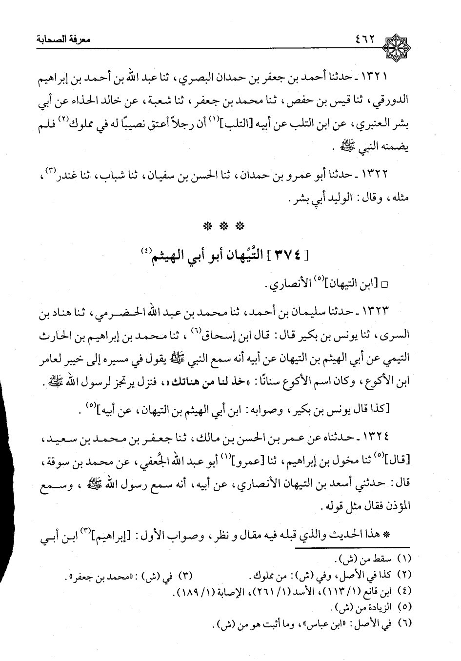 ١٣٢٤ - حُدِّثْنَاهُ عَنْ عُمَرَ بْنِ الْحَسَنِ بْنِ مَالِكٍ، ثنا جَعْفَرُ بْنُ مُحَمَّدِ بْنِ سَعِيدٍ، قَالَ: ثنا مُخَوَّلُ بْنُ إِبْرَاهِيمَ، ثنا عَمْرٌو أَبُو عَبْدِ اللهِ الْجُعْفِيُّ، عَنْ مُحَمَّدِ بْنِ سُوقَةَ، قَالَ: حَدَّثَنِي أَسْعَدُ بْنُ التَّيِّهَانِ الْأَنْصَارِيُّ، عَنْ أَبِيهِ، أَنَّهُ سَمِعَ رَسُولَ اللهِ صَلَّى اللَّهُ عَلَيْهِ وَسَلَّمَ، وَسَمِعَ الْمُؤَذِّنَ، فَقَالَ مِثْلَ قَوْلِهِ. هَذَا الْحَدِيثُ وَالَّذِي قَبْلَهُ فِيهِ مَقَالٌ وَنَظَرٌ، وَصَوَابُ الْأَوَّلِ إِبْرَاهِيمُ بْنُ أَبِي ⦗٤٦٣⦘ الْهَيْثَمِ بْنِ التَّيِّهَانِ، عَنْ أَبِيهِ