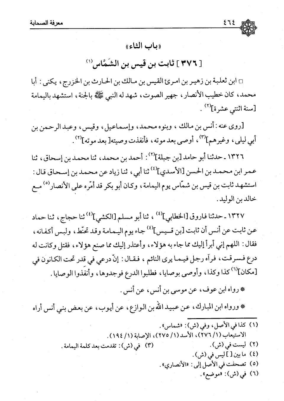 ١٣٢٦ - حَدَّثَنَا أَبُو حَامِدِ بْنُ جَبَلَةَ أَحْمَدُ بْنُ مُحَمَّدٍ، ثنا مُحَمَّدُ بْنُ إِسْحَاقَ، ثنا عُمَرُ بْنُ مُحَمَّدِ بْنِ الْحَسَنِ الْأَسَدِيُّ، ثنا أَبِي، ثنا زِيَادٌ، عَنْ مُحَمَّدِ بْنِ إِسْحَاقَ، قَالَ: «اسْتُشْهِدَ ثَابِتُ بْنُ قَيْسِ بْنِ شَمَّاسٍ يَوْمَ الْيَمَامَةِ، وَكَانَ أَبُو بَكْرٍ قَدْ أَمَّرَهُ عَلَى الْأَنْصَارِ مَعَ خَالِدِ بْنِ الْوَلِيدِ»