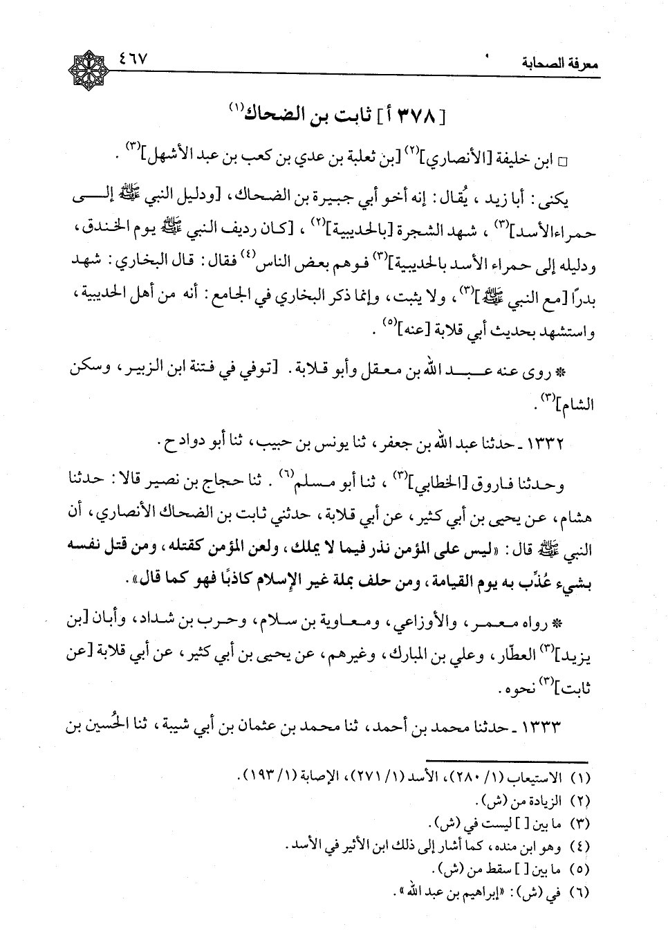 ١٣٣٣ - حَدَّثَنَا مُحَمَّدُ بْنُ أَحْمَدَ، ثنا مُحَمَّدُ بْنُ عُثْمَانَ بْنِ أَبِي شَيْبَةَ، ثنا الْحُسَيْنُ بْنُ ⦗٤٦٨⦘ عَبْدِ الْأَوَّلِ، ثنا حَفْصُ بْنُ غِيَاثٍ ح وَحَدَّثَنَا سُلَيْمَانُ بْنُ أَحْمَدَ، ثنا الْحُسَيْنُ بْنُ جَعْفَرٍ، ثنا مِنْجَابٌ، ثنا عَلِيُّ بْنُ مُسْهِرٍ، قَالَا: ثنا أَشْعَثُ بْنُ سَوَّارٍ، عَنْ أَيُّوبَ، عَنْ أَبِي قِلَابَةَ، عَنْ ثَابِتِ بْنِ الضَّحَّاكِ، قَالَ: قَالَ رَسُولُ اللهِ صَلَّى اللَّهُ عَلَيْهِ وَسَلَّمَ: «مَنْ قَتَلَ نَفْسَهُ بِشَيْءٍ مُتَعَمِّدًا عُذِّبَ بِهِ يَوْمَ الْقِيَامَةِ فِي نَارِ جَهَنَّمَ، وَمَنْ حَلَفَ بِمِلَّةٍ غَيْرِ الْإِسْلَامِ كَاذِبًا مُتَعَمِّدًا فَهُوَ كَمَا قَالَ، وَمَنْ رَمَى مُؤْمِنًا بِكُفْرٍ فَهُوَ كَقَتْلِهِ، وَمَنْ لَعَنَ مُؤْمِنًا فَهُوَ كَقَتْلِهِ» لَفْظُ مِنْجَابٍ أَتَمُّ. رَوَاهُ عَنْ أَيُّوبَ شُعْبَةُ، وَمَعْمَرٌ، وَحَمَّادُ بْنُ زَيْدٍ، وَابْنُ عُيَيْنَةَ، وَرَوْحُ بْنُ الْقَاسِمِ، وَوُهَيْبٌ