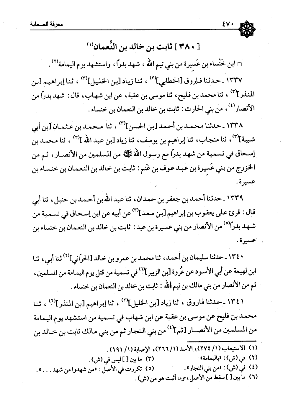 ١٢٥٠ - حَدَّثَنَا مُحَمَّدُ بْنُ أَحْمَدَ بْنِ الْحَسَنِ، ثنا مُحَمَّدُ بْنُ عُثْمَانَ بْنِ أَبِي شَيْبَةَ، ثنا مِنْجَابٌ، ثنا إِبْرَاهِيمُ بْنُ يوسُفَ، ثنا زِيَادُ بْنُ عَبْدِ اللهِ، ثنا مُحَمَّدُ بْنُ إِسْحَاقَ، «فِي تَسْمِيَةِ مَنْ شَهِدَ بَدْرًا مَعَ رَسُولِ اللهِ صَلَّى اللَّهُ عَلَيْهِ وَسَلَّمَ مِنَ الْمُسْلِمِينَ مِنَ الْأَنْصَارِ، ثُمَّ مِنَ الْخَزْرَجِ مِنْ بَنِي عَسِيرَةَ بْنِ عَبْدِ عَوْفِ بْنِ غَنْمِ ثَابِتُ بْنُ خَالِدِ بْنِ النُّعْمَانِ ابْنِ خَنْسَاءَ بْنِ عَسِيرَةَ»