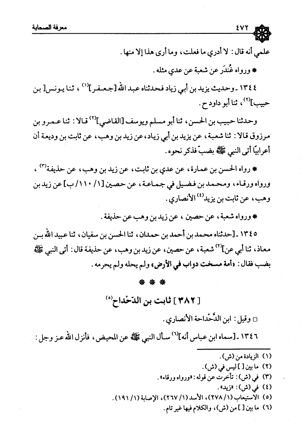 ١٣٤٦ - سَمَّاهُ ابْنُ عَبَّاسٍ أَنَّهُ سَأَلَ النَّبِيَّ صَلَّى اللَّهُ عَلَيْهِ وَسَلَّمَ عَنِ الْمَحِيضِ، فَأَنْزَلَ اللهُ عَزَّ وَجَلَّ ⦗٤٧٣⦘: {وَيَسْأَلُونَكَ عَنِ الْمَحِيضِ} [البقرة: ٢٢٢] ، ذَكَرَ ذَلِكَ ابْنُ إِسْحَاقَ، عَنْ مُحَمَّدِ بْنِ أَبِي مُحَمَّدٍ، عَنْ عِكْرِمَةَ، أَوْ سَعِيدِ بْنِ جُبَيْرٍ، عَنِ ابْنِ عَبَّاسٍ أَنَّ ثَابِتَ بْنَ دَحْدَاحَةَ سَأَلَ النَّبِيَّ صَلَّى اللَّهُ عَلَيْهِ وَسَلَّمَ، فَنَزَلَتْ هَذِهِ الْآيَةُ، تُوُفِّيَ فِي حَيَاةِ النَّبِيِّ صَلَّى اللَّهُ عَلَيْهِ وَسَلَّمَ