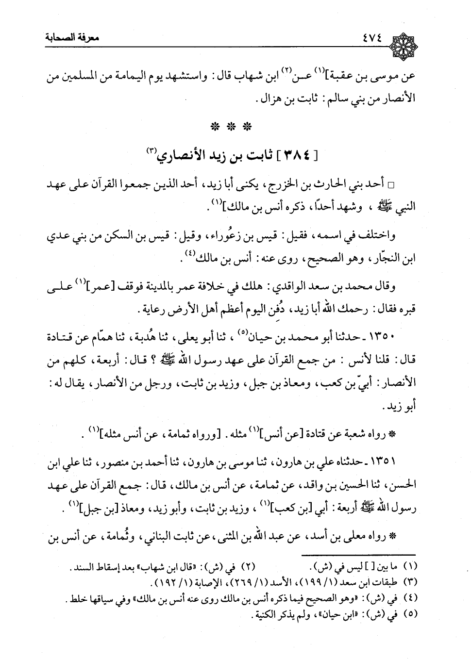 ١٣٥٠ - حَدَّثَنَا أَبُو مُحَمَّدِ بْنُ حَيَّانَ، ثنا أَبُو يَعْلَى، ثنا هُدْبَةُ، ثنا هَمَّامٌ، عَنْ قَتَادَةَ، قَالَ: قُلْنَا لِأَنَسٍ: " مَنْ جَمَعَ الْقُرْآنَ عَلَى عَهْدِ رَسُولِ اللهِ صَلَّى اللَّهُ عَلَيْهِ وَسَلَّمَ؟ قَالَ: أَرْبَعَةٌ، كُلُّهُمْ مِنَ الْأَنْصَارِ: أُبَيُّ بْنُ كَعْبٍ، وَمُعَاذُ بْنُ جَبَلٍ، وَزَيْدُ بْنُ ثَابِتٍ، وَرَجُلٌ مِنَ الْأَنْصَارِ يُقَالُ لَهُ أَبُو زَيْدٍ " رَوَاهُ شُعْبَةُ، عَنْ قَتَادَةَ، عَنْ أَنَسٍ مِثْلَهُ وَرَوَاهُ ثُمَامَةُ , عَنْ أَنَسٍ مِثْلَهُ