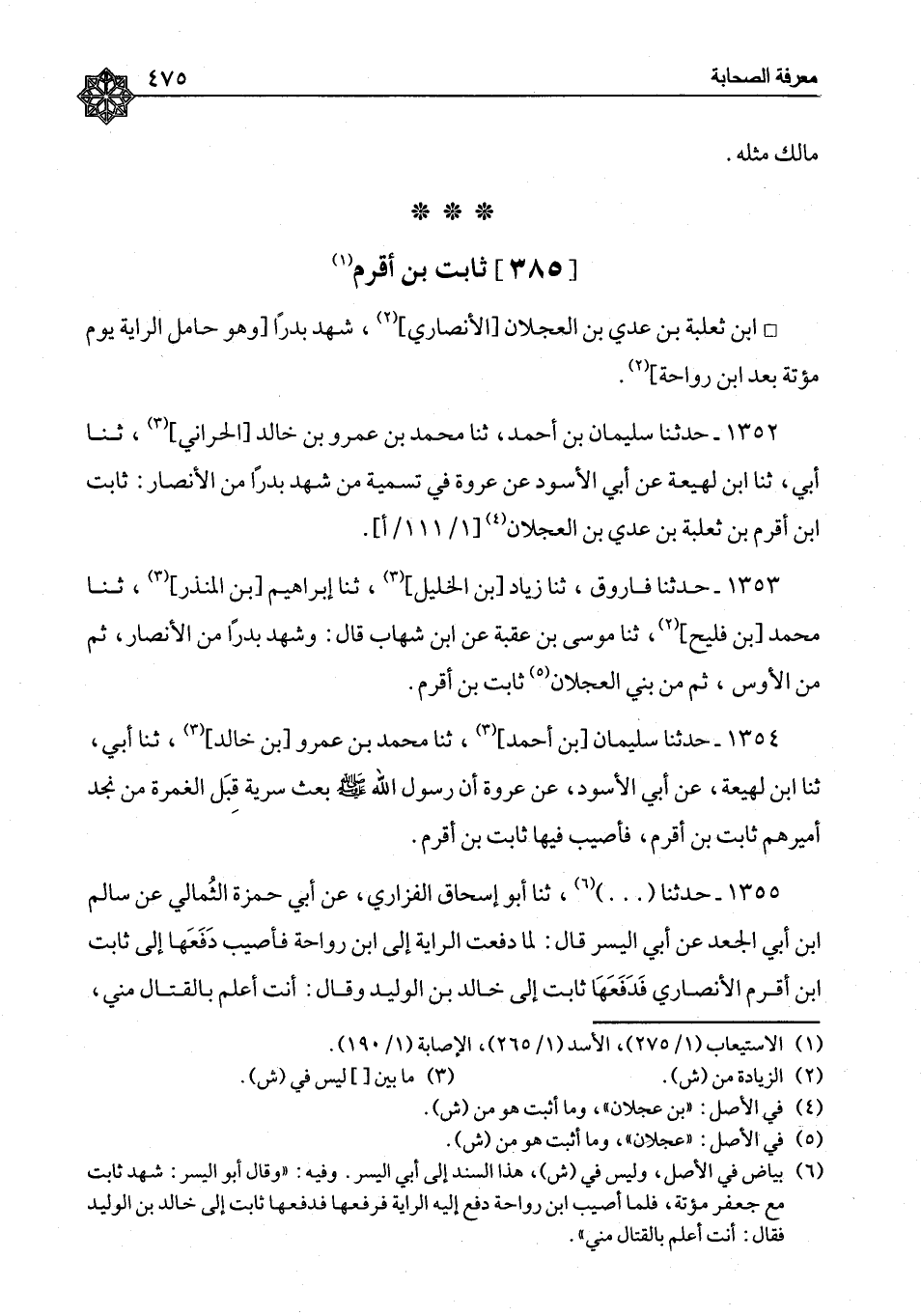 ١٣٥٣ - حَدَّثَنَا فَارُوقٌ، ثنا زِيَادُ بْنُ الْخَلِيلِ، ثنا إِبْرَاهِيمُ بْنُ الْمُنْذِرِ، ثنا مُحَمَّدُ بْنُ فُلَيْحٍ، ثنا مُوسَى بْنُ عُقْبَةَ، عَنِ ابْنِ شِهَابٍ، قَالَ: «وَشَهِدَ بَدْرًا مِنَ الْأَنْصَارِ، ثُمَّ مِنَ الْأَوْسِ، ثُمَّ مِنْ بَنِي العَجْلَانِ ثَابِتُ بْنُ أَقْرَمَ»