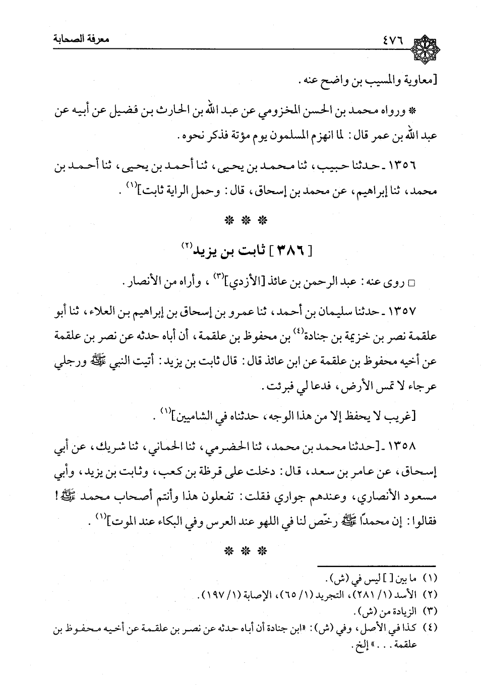 ١٣٥٦ - حَدَّثَنَا حَبِيبٌ، ثنا مُحَمَّدُ بْنُ يَحْيَى، ثنا أَحْمَدُ بْنُ يَحْيَى، ثنا أَحْمَدُ بْنُ مُحَمَّدٍ، ثنا إِبْرَاهِيمُ، عَنْ مُحَمَّدِ بْنِ إِسْحَاقَ قَالَ: «وَحَمَلَ الرَّايَةَ ثَابِتٌ»