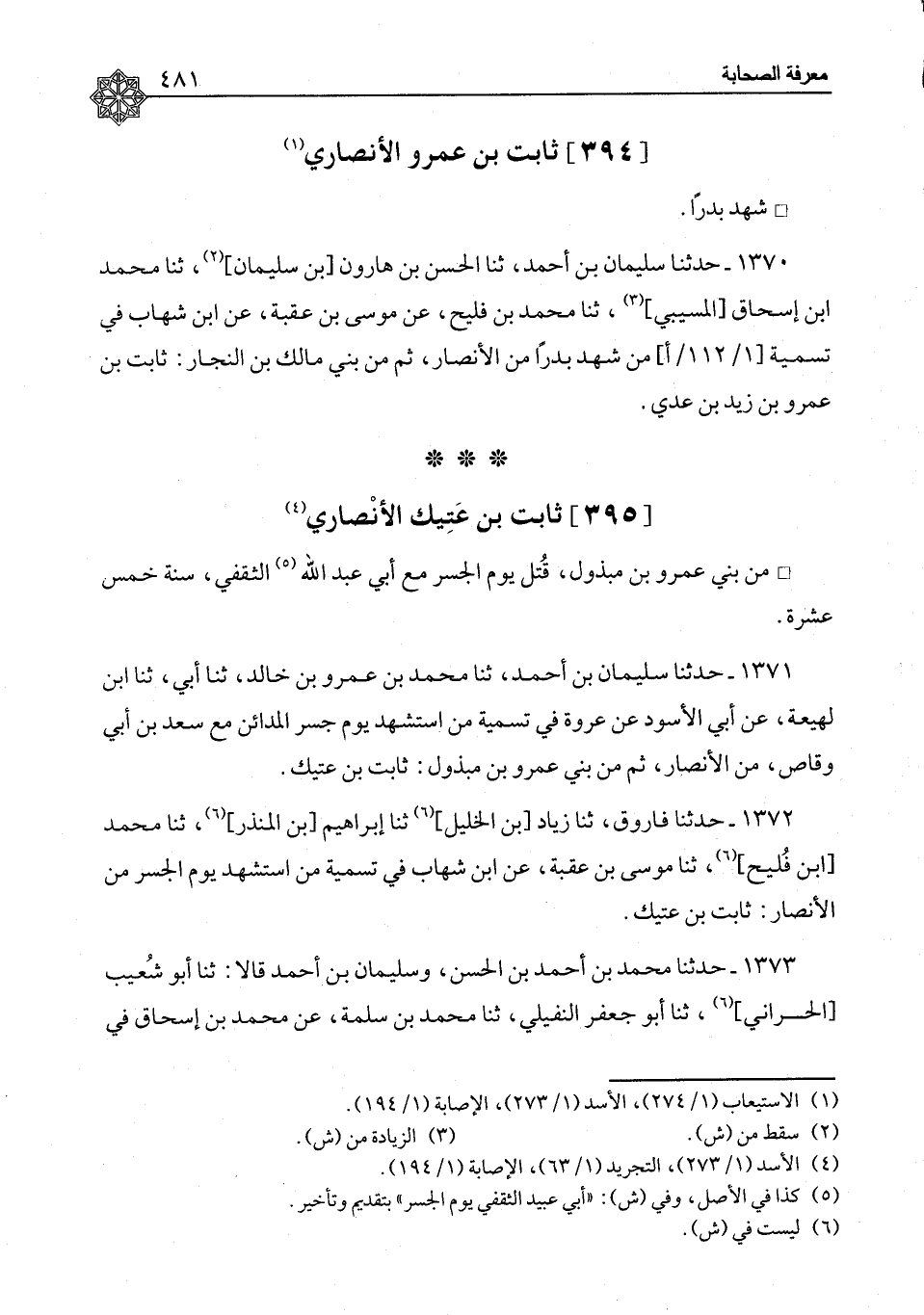 ١٣٧٣ - حَدَّثَنَا مُحَمَّدُ بْنُ أَحْمَدَ بْنِ الْحَسَنِ، وَسُلَيْمَانُ بْنُ أَحْمَدَ، قَالَا: ثنا أَبُو شُعَيْبٍ الْحَرَّانِيُّ، ثنا أَبُو جَعْفَرٍ النُّفَيْلِيُّ، ثنا مُحَمَّدُ بْنُ سَلَمَةَ، عَنْ مُحَمَّدِ بْنِ إِسْحَاقَ، " فِي ⦗٤٨٢⦘ تَسْمِيَةِ مَنِ اسْتُشْهِدَ يَوْمَ الْجِسْرِ مِنَ الْأَنْصَارِ، ثُمَّ مِنْ بَنِي عَمْرِو بْنِ مَبْذُولٍ: ثَابِتُ بْنُ عَتِيكٍ "