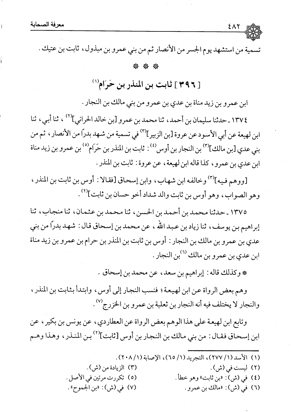 ١٣٧٥ - حَدَّثَنَا مُحَمَّدُ بْنُ أَحْمَدَ بْنِ الْحَسَنِ، ثنا مُحَمَّدُ بْنُ عُثْمَانَ، ثنا مِنْجَابٌ، ثنا إِبْرَاهِيمُ بْنُ يوسُفَ، ثنا زِيَادُ بْنُ عَبْدِ اللهِ، عَنْ مُحَمَّدِ بْنِ إِسْحَاقَ، قَالَ: «شَهِدَ بَدْرًا مِنْ بَنِي عَدِيِّ بْنِ عَمْرِو بْنِ مَالِكِ بْنِ النَّجَّارِ أَوْسُ بْنُ ثَابِتِ بْنِ الْمُنْذِرِ بْنِ حَرَامِ بْنِ عَمْرِو بْنِ زَيْدِ مَنَاةَ بْنِ عَدِيِّ بْنِ عَمْرِو بْنِ مَالِكِ بْنِ النَّجَّارِ» وَكَذَلِكَ قَالَهُ إِبْرَاهِيمُ بْنُ سَعْدٍ، عَنْ مُحَمَّدِ بْنِ إِسْحَاقَ، وَهِمَ بَعْضُ الرُّوَاةِ عَنِ ابْنِ لَهِيعَةَ، فَنَسَبَ النَّجَّارَ إِلَى أَوْسٍ، وَابْتَدَأَ بِثَابِتِ بْنِ الْمُنْذِرِ. وَالنَّجَّارُ لَا يُخْتَلَفُ فِيهِ أَنَّهُ النَّجَّارُ بْنُ ثَعْلَبَةَ بْنِ عَمْرِو بْنِ الْخَزْرَجِ. وَتَابَعَ ابْنَ لَهِيعَةَ عَلَى هَذَا الْوَهْمِ بَعْضُ الرُّوَاةِ، عَنِ الْعُطَارِدِيِّ، عَنْ يُونُسَ بْنِ بُكَيْرٍ، عَنِ ابْنِ إِسْحَاقَ، فَقَالَ: مِنْ بَنِي مَالِكِ بْنِ النَّجَّارِ بْنِ أَوْسٍ ثَابِتُ بْنُ الْمُنْذِرِ. وَهَذَا وَهْمٌ ⦗٤٨٣⦘ ظَاهِرٌ؛ لِأَنَّ النَّجَّارَ هُوَ ابْنُ ثَعْلَبَةَ بْنِ مَالِكٍ، وَأَوْسٌ هُوَ ابْنُ ثَابِتِ بْنِ الْمُنْذِرِ، عَلَى مَا رَوَاهُ ابْنُ شِهَابٍ، وَابْنُ إِسْحَاقَ فِي رِوَايَةِ الْأَثْبَاتِ عَنْهُمَا