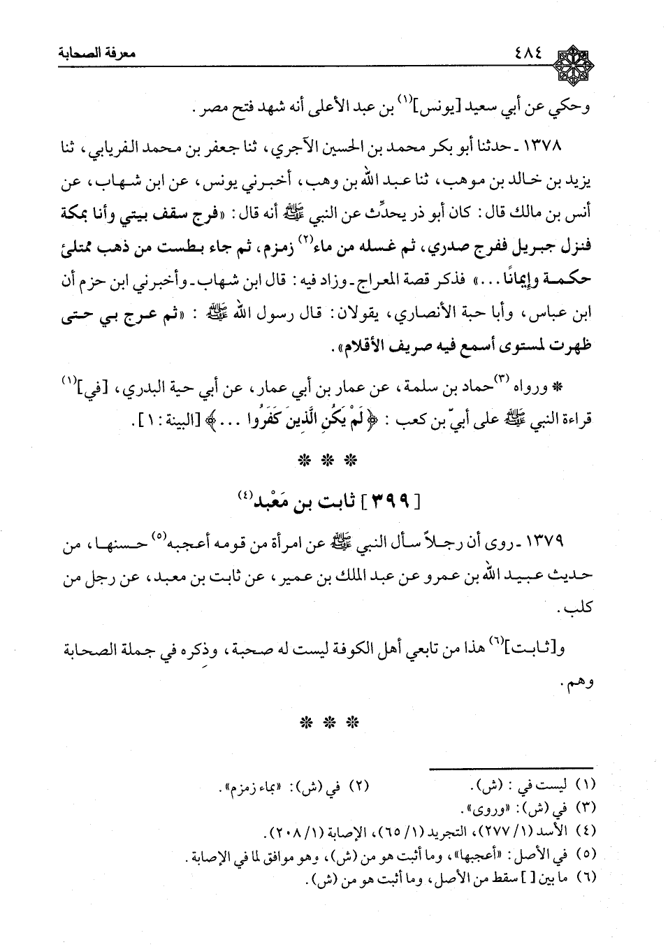 ١٣٧٩ - رُوِيَ أَنَّ رَجُلًا سَأَلَ النَّبِيَّ صَلَّى اللَّهُ عَلَيْهِ وَسَلَّمَ عَنِ امْرَأَةٍ مِنْ قَوْمِهِ أَعْجَبَهُ حُسْنُهَا. مِنْ حَدِيثِ عُبَيْدِ اللهِ بْنِ عَمْرٍو، عَنْ عَبْدِ الْمَلِكِ بْنِ عُمَيْرٍ، عَنْ ثَابِتِ بْنِ مَعْبَدٍ، عَنْ رَجُلٍ مِنْ كَلْبٍ، وَثَابِتٌ هَذَا مِنْ تَابِعِي أَهْلِ الْكُوفَةِ، لَيْسَتْ لَهُ صُحْبَةٌ، وَذِكْرُهُ فِي جُمْلَةِ الصَّحَابَةِ وَهْمٌ