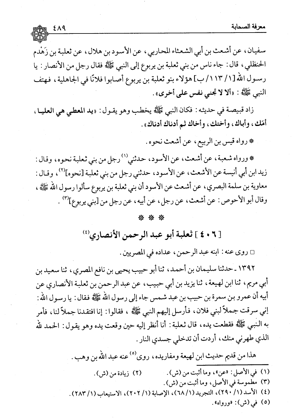 ١٣٩٢ - حَدَّثَنَا سُلَيْمَانُ بْنُ أَحْمَدَ، ثنا أَبُو حَبِيبٍ يَحْيَى بْنُ نَافِعٍ الْمِصْرِيُّ، ثنا سَعِيدُ بْنُ أَبِي مَرْيَمَ، ثنا ابْنُ لَهِيعَةَ، ثنا يَزِيدُ بْنُ أَبِي حَبِيبٍ، عَنْ عَبْدِ الرَّحْمَنِ بْنِ ثَعْلَبَةَ الْأَنْصَارِيِّ، عَنْ أَبِيهِ، أَنَّ عَمْرَو بْنَ سَمُرَةَ بْنِ حَبِيبِ بْنِ عَبْدِ شَمْسٍ، جَاءَ إِلَى رَسُولِ اللهِ صَلَّى اللَّهُ عَلَيْهِ وَسَلَّمَ، فَقَالَ: يَا رَسُولَ اللهِ، إِنِّي سَرَقْتُ جَمَلًا لِبَنِي فُلَانٍ. فَأَرْسَلَ إِلَيْهِمُ النَّبِيُّ صَلَّى اللَّهُ عَلَيْهِ وَسَلَّمَ، فَقَالُوا: إِنَّا افْتَقَدْنَا جَمَلًا لَنَا. " فَأَمَرَ بِهِ النَّبِيُّ صَلَّى اللَّهُ عَلَيْهِ وَسَلَّمَ، فَقُطِعَتْ يَدُهُ. قَالَ ثَعْلَبَةُ: أَنَا أَنْظُرُ إِلَيْهِ حِينَ وَقَعَتْ يَدُهُ وَهُوَ يَقُولُ: الْحَمْدُ لِلَّهِ الَّذِي طَهَّرَنِي مِنْكِ، أَرَدْتِ أَنْ تُدْخِلِي جَسَدِي النَّارَ " هَذَا مِنْ قَدِيمِ حَدِيثِ ابْنِ لَهِيعَةَ وَمَفَارِيدِهِ، رَوَى عَنْهُ عَبْدُ اللهِ بْنُ وَهْبٍ، ⦗٤٩٠⦘ حَدَّثَنَاهُ أَبُو عَمْرِو بْنُ حَمْدَانَ، ثنا الْحَسَنُ بْنُ سُفْيَانَ، ثنا حَرْمَلَةُ بْنُ يَحْيَى، ثنا عَبْدُ اللهِ بْنُ وَهْبٍ، أَخْبَرَنِي ابْنُ لَهِيعَةَ، عَنْ يَزِيدَ بْنِ أَبِي حَبِيبٍ، عَنْ عَبْدِ الرَّحْمَنِ بْنِ ثَعْلَبَةَ الْأَنْصَارِيِّ، عَنْ أَبِيهِ أَنَّ عَمْرَو بْنَ سَمُرَةَ أَتَى رَسُولَ اللهِ صَلَّى اللَّهُ عَلَيْهِ وَسَلَّمَ: فَقَالَ: يَا رَسُولَ اللهِ، إِنِّي سَرَقْتُ جَمَلًا لِبَنِي فُلَانٍ. فَذَكَرَ مِثْلَهُ سَوَاءً