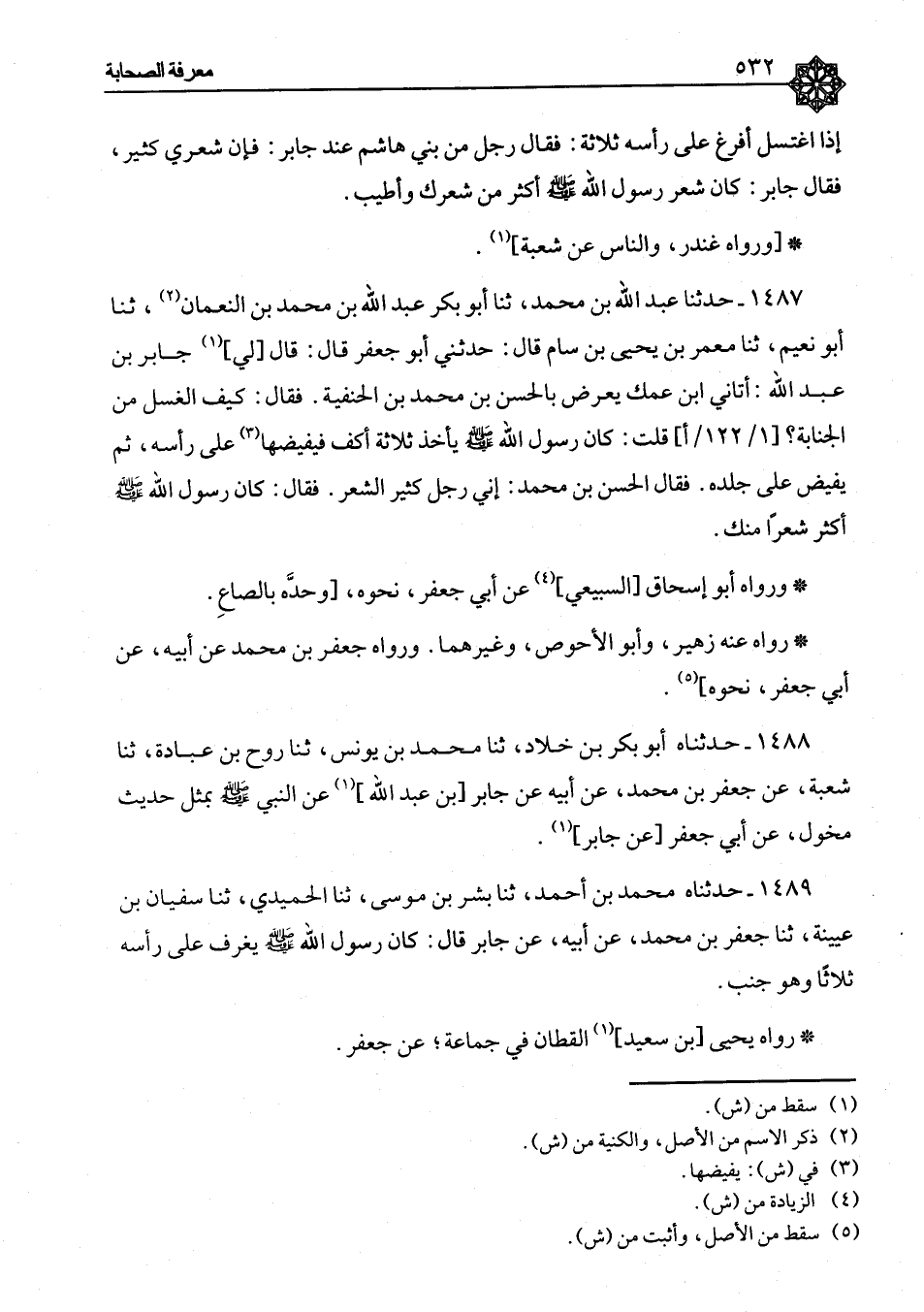 ١٣٩٤ - حَدَّثَنَا عَبْدُ اللهِ بْنُ مُحَمَّدٍ، ثنا أَبُو بَكْرٍ عَبْدُ اللهِ بْنُ مُحَمَّدِ بْنِ النُّعْمَانِ، ثنا أَبُو نُعَيْمٍ، ثنا مَعْمَرُ بْنُ يَحْيَى بْنِ سَامٍ، قَالَ: حَدَّثَنِي أَبُو جَعْفَرٍ، قَالَ: قَالَ لِي جَابِرُ بْنُ عَبْدِ اللهِ: أَتَانِي ابْنُ عَمِّكَ يُعَرِّضُ بِالْحَسَنِ بْنِ مُحَمَّدٍ ابْنِ الْحَنَفِيَّةِ، فَقَالَ: كَيْفَ الْغُسْلُ مِنَ الْجَنَابَةِ؟ قُلْتُ: كَانَ رَسُولُ اللهِ صَلَّى اللَّهُ عَلَيْهِ وَسَلَّمَ يَأْخُذُ ثَلَاثَةَ أَكُفٍّ فَيُفِيضُهَا عَلَى رَأْسِهِ، ثُمَّ يُفِيضُ عَلَى جِلْدِهِ، فَقَالَ الْحَسَنُ بْنُ مُحَمَّدٍ إِنِّي رَجُلٌ كَثِيرُ الشَّعْرِ، فَقَالَ: كَانَ رَسُولُ اللهِ صَلَّى اللَّهُ عَلَيْهِ وَسَلَّمَ أَكْثَرَ شَعْرًا مِنْكَ " وَرَوَاهُ أَبُو إِسْحَاقَ السَّبِيعِيُّ، عَنْ أَبِي جَعْفَرٍ نَحْوَهُ وَحَدَّهُ بِالصَّاعِ. رَوَاهُ عنهُ زُهَيْرٌ، وَأَبُو الْأَحْوَصِ، وَغَيْرُهُمَا. وَرَوَاهُ جَعْفَرُ بْنُ مُحَمَّدٍ، عَنْ أَبِيهِ أَبِي جَعْفَرٍ نَحْوَهُ حَدَّثَنَاهُ أَبُو بَكْرِ بْنُ خَلَّادٍ، ثنا مُحَمَّدُ بْنُ يُونُسَ، ثنا رَوْحُ بْنُ عُبَادَةَ، ثنا شُعْبَةُ، عَنْ جَعْفَرِ بْنِ مُحَمَّدٍ، عَنْ أَبِيهِ، عَنْ جَابِرِ بْنِ عَبْدِ اللهِ، عَنِ النَّبِيِّ، صَلَّى اللَّهُ عَلَيْهِ وَسَلَّمَ بِمِثْلِ حَدِيثِ مُخَوَّلٍ، عَنْ أَبِي جَعْفَرٍ عَنْ جَابِرٍ